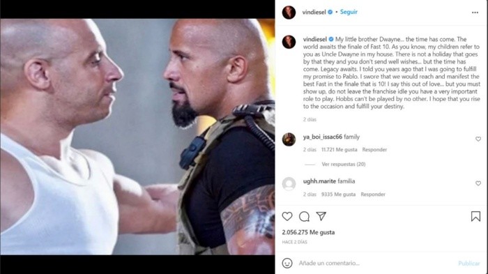 Así como hicieron públicas sus diferencias durante la filmación de "Rápidos y Furiosos 8", Vin Diesel ahora le pide abiertamente a Dwayne Johnson, ante todos sus fans, que regrese a terminar la saga fílmica.En 2016 comenzaron las diferencias entre estos dos actores, luego de que en redes sociales Dwayne "La Roca" Johnson publicó que en la producción de Rápidos y Furiosos había mucha gente profesional, pero otra... no tanto.En la portada de una revista Vin Diesel dio su respuesta y ventiló lo difícil que era trabajar con la Roca... el problema llegó a ser tan grande que los actores tuvieron que filmar sus escenas por separado.De manera extraoficial se dijo que el rompimiento se dio luego de que la Roca aceptara hacer el spin off de "Rápidos y Furiosos", titulado "Hobbs and Shaw", por el cual, además, se retrasó el estreno de la novena entrega de la franquicia.Tras el estreno de la "Rápidos y Furiosos 9", Vin Diesel públicamente, casi en tono de súplica, le pide a la Roca volver y cerrar con broche de oro esta saga."Mi pequeño hermano Dwayne… Ha llegado el momento. El mundo espera el final de Rápidos y furiosos 10. Como sabes, mis hijos se refieren a ti como tío Dwayne en mi casa. No hay día festivo que pase para ellos y que tú no envíes buenos deseos"."Ha llegado el momento. El legado aguarda. Te dije hace años que le iba a cumplir mi promesa a Paul. ¡Juré que alcanzaríamos la mejor película en el final, que será la 10! Lo digo con amor … pero debes presentarte, no dejes inactiva la franquicia, tienes un papel muy importante que jugar. 'Hobbs' no puede ser interpretado por ningún otro. Espero que estés a la altura de las circunstancias y cumplas tu destino", escribió Diesel.La publicación tiene más de 2 millones de Me Gusta en Instagram, entre ellos el de Joana Brewster, Mia en la saga.Se tiene previsto que la última cinta de la saga se estrene en 2023.JL
