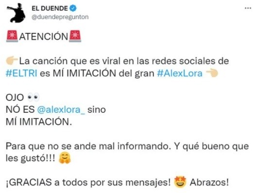 Una canción dedicada a Andrés Manuel López Obrador (AMLO) se volvió viral en redes sociales al tomar el tema “Todo me sale mal”, un éxito de Alex Lora, líder del Tri.Este audio se transmitió originalmente por el programa “Así las cosas” con Carlos Loret de Mola y “El Duende Preguntón” —Christian Ahumada—, y la lírica de la canción criticaba algunos planes de AMLO durante su mandato, como el Tren Maya y el desabasto de medicamentos.“La banda le dice que todo lo que hace, todo lo que hace, todo lo que hace está mal y lo vuelve a hacer. El pueblo le dice que todo lo que hace, todo lo que hace, todo lo que hace está mal y lo vuelve a hacer. Él echa muchos choros y por eso nada le sale bien”, se expone en la canción.Aunque parece que Alex Lora es quien interpreta su tema “Todo me sale mal” con modificaciones, se trata de Alex “Loro”, una de las voces que interpreta Ahumada. Tanto es el parecido de las voces, que el propio Christian tuvo que aclarar que sólo se trató de una imitación.“La canción que es viral en las redes sociales de El Tri es MI IMITACIÓN del gran Alex Lora”, escribió en Twitter.AC