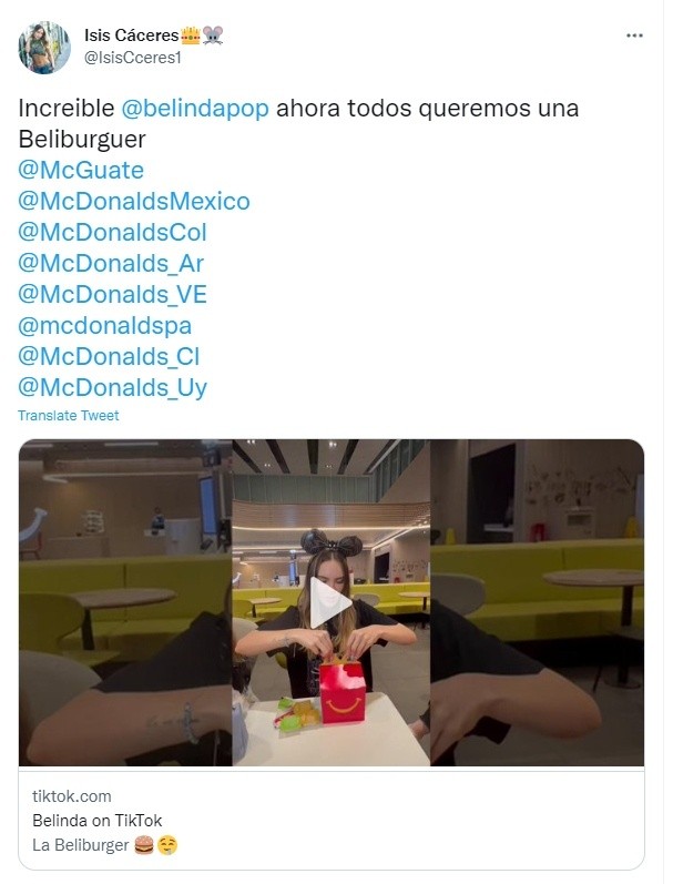 Belinda tiene gran disciplina cuando de ejercitarse se trata, sin embargo, la cantante ha dicho en múltiples ocasiones que tampoco se restringe de comer lo que le gusta. Por ello, se animó a compartir con sus seguidores un tutorial de cómo prepara su hamburguesa favorita, a la que denominó como "la beliburguer".La cantante mostró su gusto por las hamburguesas. En un video de "TikTok", la también actriz explicó cuáles eran los pasos que seguía para preparar su hamburguesa perfecta, la cual título con el nombre de "la beliburguer".En el clip, puede verse acompañada por un grupo de amigas y amigos, entre ellos también está su madre Belinda Schüll, en un famoso restaurante de comida rápida. "Y así es como preparo mi hamburguesa". Luego de abrir la caja donde de la hamburguesa, explica paso a paso de la preparación:"Fuera los pepinillos y ahora viene la mejor parte, partimos los nuggets en pedacitos y los metemos en la hamburguesa, ponemos la mostaza miel, después sweet n´sour y por último la kétchup. Y es así como se prepara una 'beliburguer', remata la cantante luego de darle una gran mordida, acompañada de una carcajada de quienes la acompañan.Internet no se hizo esperar y sus fans plasmaron en redes sociales su deseo de encontrar esta hamburguesa en el menú del restaurante de comida rápida.