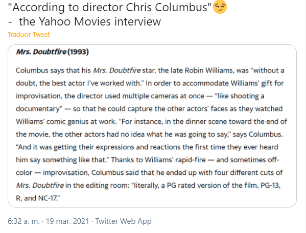 No todo en las redes sociales es “cancelar” series, películas y dibujos animados del pasado debido a que incumplen con los estándares de la actualidad, también hay usuarios de Twitter que están pidiendo una versión alternativa de “Papá por siempre” en la que la increíble capacidad de improvisación de Robin Williams obligaría a cambiar su clasificación para una audiencia madura.Fue la cuenta Film Facts (@factsonfilm) la que puso en el radar la supuesta existencia de esta versión el pasado 18 de marzo; en el tuit se comparte una fotografía del protagonista, Robin Williams, en su personaje de Mrs. Doubtfire acompañando el dato: “Mientras filmaba 'Mrs. Doubtfire' (1993), Robin Williams improvisó tanto que hubo cortes PG, PG-13, R y NC-17 de la película”.De inmediato las reacciones se hicieron presentes en respuesta a dicha publicación demandando que esa versión pudiera ser vista, incluso con algunos memes. Otros usuarios cuestionan qué fue lo que Williams debió haber hecho como para que una película familiar estuviera cerca de una clasificación R.Entre los comentarios se recuerda además, una entrevista en la que el director de la película, Chris Columbus, habla sobre las aptitudes histriónicas de Robin Williams y su facilidad para que, pese a salirse del guion, la filmación no se viera interrumpida y que, al contrario, la producción requirió hacer uso de varias cámaras para filmar desde diferentes ángulos a Williams haciendo su “magia”."Por ejemplo, la escena en el comedor casi al final de la película, los otros actores no tenían idea de lo que él iba a decir", recuerda Columbus; "Estaban captándose sus reacciones y expresiones la primera vez que ellos lo escucharon decir semejante cosa".En este fragmento el director recuerda que, gracias a la agilidad de Williams para improvisar, la producción terminó con cuatro versiones diferentes de "Papá por siempre", incluida la NC-17 (en la que no se admiten menores de 17 años) y la R (en la que se restringe el acceso a menores de edad).