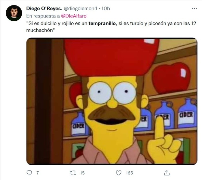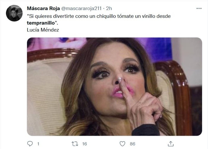 El hashtag "#Tempranillo" rápidamente se convirtió en tendencia en Twitter, y todo debido a la actriz y cantante Lucía Méndez, quien desató los memes y risas luego de que internautas recuperaran el fragmento de una entrevista que dio donde aparentemente confundió la uva tempranillo con con beber “tempranillo”.El video difundido en redes corresponde a una charla que Méndez sostuvo con la periodista de espectáculos Matilde Obregón; durante la entrevista, la intérprete narró cómo enfrentó la pandemia de COVID-19 desde su casa.En un momento de la plática, Lucía Méndez comentó que cuando inició la emergencia sanitaria por coronavirus en México recurrió a una bicicleta estática para seguir con sus rutinas de ejercicio y estaba un poco triste por no poder visitar a sus amigos y familiares.“Me asomo por el ventanal de mi comedor y veo a México vacío, sin nadie, un día medio nublado y ¡ay comadre!, que me pongo un cuete de buro”, se escucha. “Tú sabes que yo no tomo. Empecé a tomar como tres, cuatro copas de vino tinto: 'Un vinito tinto y ahorita me pongo hasta atrás' ”, continuó.Lucía Méndez prosiguió con su relato y mencionó que el vino que tomó fue un regalo que le hizo una de sus amigas: “Un vinito muy bueno que me regaló una amiga que es una mujer catadora de vinos increíble y a mí me regaló el vino. Sabía riquísimo, no me sabía tan fuerte, porque es así como yo me emborracho, cuando el alcohol no me sabe a alcohol; y me sabía muy a uva porque era un vino muy joven. Ella me explicó que cuando la uva es joven es menos fuerte”, dijo.Matilde Obregón la interrumpió para señalar que posiblemente se trataba de un “tempranillo”, un vino elaborado con la uva de cepa española que se caracteriza por ser amable y sedoso al palada; sin embargo, la actriz no lo entendió de esa manera y confundió el nombre de la fruta con la manera de nombrar un espacio temporal del día.“Era un tempranillo de seguro”, comentó la periodista. “Sí, eran como las 11 de la mañana y dije no, dale, dale, dale. Entonces ya medio jarra me paré y dije: 'Tengo que hacer algo por México' ”. siguió.Tanto Lucía Méndez como Matilde Obregón siguieron con la entrevista como si nada. A pesar de que la charla ya tiene tiempo que se realizó, recientemente se ha recuperado el fragmento de la confusión y lo viralizaron en redes.JM