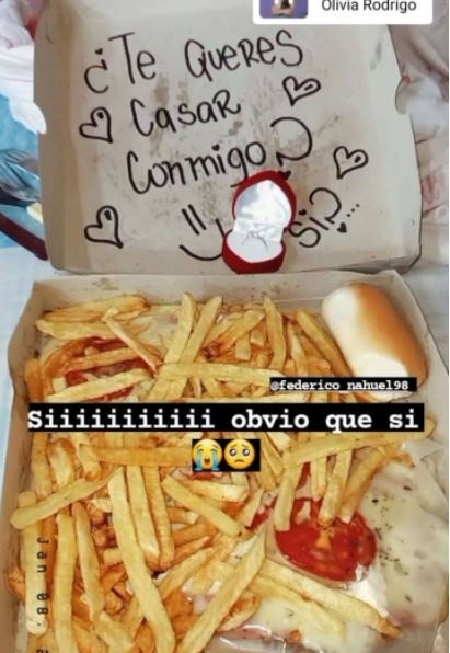 Pedir matrimonio con una caja de milanesas y papas fritas es algo que no se ve todos los días, y por ello es que esta pareja se volvió viral en redes sociales al compartir su historia.Se trata de Nahuel Pedemonte y Lourdes, una pareja de Buenos Aires, Argentina, que se volvió noticia en enero de 2021, según el medio TN. De acuerdo con el medio, Pedemonte recibió un impacto grave de bala en la cabeza el año pasado y fue su novia quien lo cuidó. Tras ir sanando meses después, él le pidió que se casaran con una caja de papas fritas, milanesas y, por supuesto, el anillo.“Fue un pilar importante para mí”, dijo el joven al medio citado. “No me va a alcanzar la vida para agradecerle. Yo sé que voy a estar con kinesiología durante mucho tiempo, pero la verdad es que ando bien. Hago flexiones, me arrodillo. Gané mucha interdependencia con los brazos. Me ayudan a bañarme y cambiarme”.Esta historia de amor se robó el corazón de muchos en las redes sociales, quienes la han compartido. ¿A ti qué te parece esta romántica historia?La boda de esta bella pareja se llevará a cabo en los próximos meses.AC