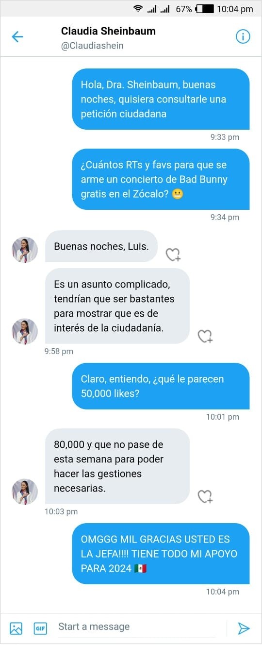 El usuario de Twitter @LuisLazos ha generado polémica en la red social al compartir el testigo de una supuesta charla con la jefa de Gobierno de Ciudad de México, Claudia Sheinbaum, en la que le socita a la mandataria poder realizar un concierto gratuito de Bad Bunny, quien anunció que tendrá gira en México.En la charla, vía mensaje privado, que el usuario compartió se lee cómo @LuisLazos saluda a la jefa de Gobierno Claudia Sheinbaum y le refiere que quiere hacer una petición ciudadana, a lo que la mandataria responde saludando y explicando las complicaciones de realizar el evento.El usuario refirió en la supuesta charla que cuántos RT’s y “favs” (reacciones) serían necesarias para poder realizar el concierto gratuito de Bad Bunny en el Zócalo de la Ciudad de México, a lo que Sheinbaum respondió que “Es un asunto complicado, tendrían que ser bastantes para mostrar que es de interés de la ciudadanía”.El fan interesado respondió que si la meta podrían ser 50 mil “likes”, a lo que supuestamente Claudia Sheinbaum habría respondido que el reto tendría que ser el superar más cantidad de reacciones: “80,000 y que no pase de esta semana para poder hacer las gestiones necesarias”, habría respondido la mandataria.El usuario compartió una captura de pantalla de la supuesta conversación con la cuenta de Jefa de Gobierno, lo que ha generado discusión y sorpresa entre otros internautas de la red social, al considerar que existen otras prioridades y urgencias en el país que estar solicitando un concierto gratuito y masivo en plana contingencia por COVID-19. Hay quienes han mencionado que los gobiernos deben enfocarse en brindar seguridad a los periodistas, establecer redes de apoyo para personas en condición de calle y principalmente tener más rigurosidad en los protocolos sanitarios ante el incrementos de contagios por coronavirus.Hasta el momento, la imagen de la mencionada charla con la Jefa de Gobierno ha generado 161 retweets, 76 tweets citados y 1,870 “me gusta” (likes).Diversos usuarios han mostrado sorpresa de que haya otros miembros de la red en creer que la conversación con Clauda Sheinbaum es real, otros han señalado burlas hacia la intención de poder realizar un concierto con el mencionado artista, en tanto que otros han reaccionado favorablemente a la petición de tener a Bad Bunny en un concierto gratuito en el Zócalo capitalino.Hasta el momento, Claudia Sheinbaum no ha compartido una postura que confirme o desmienta la supuesta conversación filtrada en Twitter, aunque hubo usuarios que la etiquetaron en los comentarios para saber si la petición del concierto era real o falsa.JL