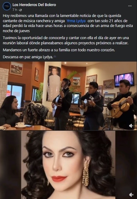 Yrma Lydya, de sólo 21 años, fue asesinada por su esposo en la Ciudad de México mientras discutían.Su esposo es un abogado de 79 años quien habría disparado tres veces en contra de la joven dentro del restaurante Suntory, ubicado en la esquina de Torres Adalid y Avenida Magdalena, colonia Del Valle Norte.A través de su perfil de Facebook, la agrupación los Herederos del Bolero recordó la última canción que interpretó Yrma y publicó un video en el que tocaron una canción con ella. Entonó la canción de "Mucho Corazón" de la compositora mexicana Ema Elena Valdelamar."Hoy recibimos una llamada con la lamentable noticia de que la querida cantante de música ranchera y amiga Yrma Lydya con tan solo 21 años de edad perdió la vida hace unas horas a consecuencia de un arma de fuego esta noche de jueves", escribieron."Tuvimos la oportunidad de conocerla y cantar con ella el día de ayer en una reunión laboral dónde planeábamos algunos proyectos próximos a realizar. Mandamos un fuerte abrazo a su familia con todo nuestro corazón. Descansa en paz amiga Lydya", difundió la agrupación.Yrma participó en el espectáculo GranDiosas, que reúne a varias de las más grandes cantantes de género ranchero, banda, norteño y mariachi. La intérprete ofreció una gira este año como artista invitada de Angélica Carrasco, María del Sol, Dulce, María Conchita, Alicia Villareal, Karina y Janette.Fue hija de Carlos Quiñones, quien fuera uno de los empresarios más influyentes de México.En 2015 lanzó su primer álbum “Regalo de Dios” y en 2017 estrenó “Hablando Claro”.En la televisión, Yrma participó en programas como Fiesta Mexicana de Las Estrellas en 2015, 2018 y 2019; también en Matutino Express, Música Hecha en México y Bandamax, entre otros.La cantante fue reconocida por el Senado de la República y la Cámara de Diputados con el Premio Nacional de Cultura y con el Doctorado Honoris Causa por sus aportes a la cultura y méritos propios.Las primeras versiones señalan que, presuntamente por una discusión, el abogado asesinó a su esposa de varios disparos de arma de fuego, por lo que fue detenido.Los hechos ocurrieron la noche del jueves 23 de junio en una sección privada del restaurante Suntory, en el que, tras una supuesta discusión, el presunto feminicida accionó un arma de fuego.Efectivos de la PBI realizaba acciones de seguridad en la zona y fueron alertados por los comensales de un establecimiento, de un reporte de detonaciones al interior del sitio, por lo que, con las precauciones del caso, se trasladaron al punto.Al llegar, solicitaron los servicios médicos para la mujer que se encontraba herida; paramédicos que arribaron al sitio la diagnosticaron sin signos vitales por lesiones por arma de fuego.Los efectivos detuvieron al probable agresor, un hombre de 79 años de edad, identificado como esposo de la mujer, cuando trataba de huir a bordo de un vehículo, a quien le informaron sus derechos de ley y trasladaron ante el agente del Ministerio Público, quien definirá su situación jurídica y realizará las investigaciones del caso.Además detuvieron a su escolta y chofer, quien ayudó al sujeto a salir del lugar.AC