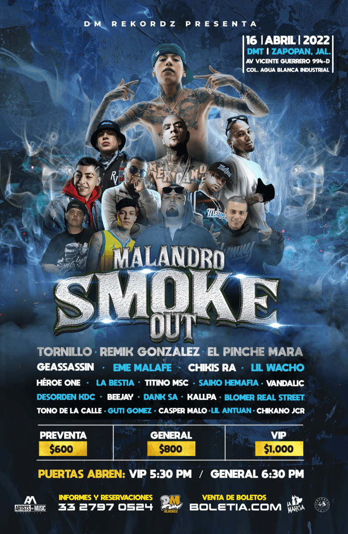 Este lunes, DM Rekordz anunció el concierto Malandro Smoke Out con el “line up más pesado de Zapopan” con artistas como Tornillo, Remik González, El Pinche Mara y Eme Malafe, entre otros.De acuerdo con organizadores, el evento se llevará a cabo el próximo 16 de abril en el Club DMT en Zapopan.A la lista de artistas se le suman Geassassin, Chikis Ra, Lil Wacho, Héroe One, La Bestia, Titino MSC, Saiko Hemafia, Vendaliz, Desorden KDC, Beejay, Dank SA, Kallpa, Blomer Real Street, Tono de la Calle, Guti Gomez, Casper Malo, Lil Antuan y Chikano JCR. Los fans podrán adquirir sus boletos a través de Boletia en la preventa ya disponible. Los precios por boleto están en 600 pesos en preventa, y a 800 en el día del evento.Además, la opción VP —para los amantes de las rimas y que quieran compartir tiempo con los raperos— tendrá un costo de mil pesos mexicanos.El concierto Malandro Smoke Out iniciará a las 6:30 pm y se seguirán todas las medidas sanitarias para seguir garantizando la seguridad de todos. Para aquellos que tengan un pase VIP podrán llegar a partir de las 5:30 pm.AC