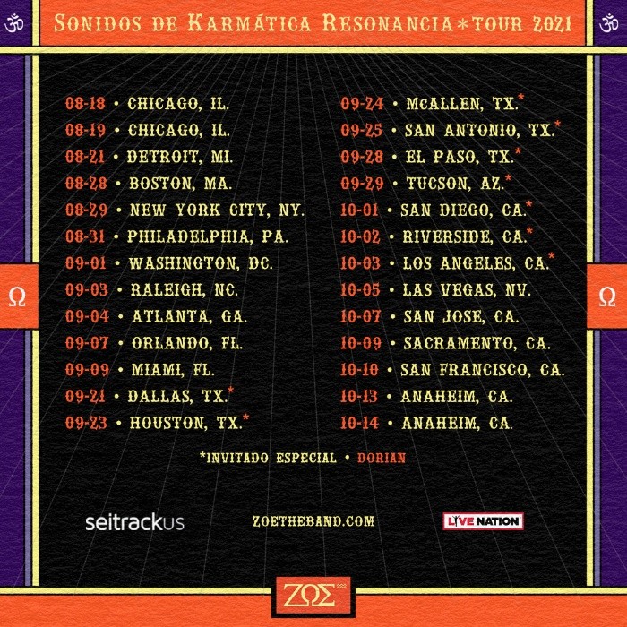 La banda mexicana de rock, Zoé, anuncia su nueva gira alrededor de los Estados Unidos en celebración del lanzamiento de su séptimo álbum de estudio, "Sonidos de Karmática Resonancia".La homónima gira de 26 fechas comenzará a finales de agosto con dos conciertos en el House of Blues de Chicago y culminará a mediados de octubre en Anaheim, California, según revela el comunicado de Ocesa.Cada vez son más los artistas que comienzan a reactivar sus presentaciones en vivo, al menos en las ciudades donde hay mayor control sobre la pandemia, como es el caso de Estados Unidos.Sobre el material discográfico reciente, en 2019, al finalizar la gira Aztlán, León Larregui, vocalista y líder de la banda, sintió una necesidad de regresar al estudio de inmediato. "No tenía ganas de hacer un disco solista, sino aprovechar el momento tan sólido que vivíamos como grupo. La idea era hacer un disco muy rápido, impulsados por nuestra propia cohesión. Empezamos a trabajar y de inmediato salieron unas ocho canciones...hasta que nos cayó la pandemia encima".La crisis puso en pausa los planes de la banda; sin embargo, el resultado de un "turbulento" proceso creativo de más de un año, es quizá el trabajo más ingenioso, maduro, y completo de Zoé a la fecha.Desde el melancólico synth-pop de "SKR" y la atmósfera melodramática de "Fiebre" hasta el melódico coro de "Velur", "Sonidos de Karmática Resonancia" presume todos los elementos característicos que han convertido a Zoé en íconos del rock alrededor del continente. Melodías angulares, ritmos propulsores y coros adictivos inspiran a sus oyentes a bailar y hasta a soñar despiertos… a veces ambas al mismo tiempo, se externa en el comunicado.Esta vez, la amplia gama de estilos -neo-psicodelia, notas de rock espacial, y toques de new wave- se mezclan como nunca antes. La habilidad de Zoé para generar ambientes cinematográficos está anclada a una colección de gloriosas melodías."En estas canciones puedes escuchar el cúmulo de influencias que hemos almacenado con los años: de los discos de Pink Floyd a The Cure, hasta cosas exóticas, como sonidos de África y Oriente, además de otras referencias menos explícitas, como Nina Simone, Donovan o Johnny Cash", afirma Sergio Acosta, guitarrista y cofundador de Zoé."También ha cambiado mi forma de componer", añade Larregui, "antes necesitaba bajar una idea a la guitarra, y hoy puede ser que vaya caminando por la calle y escuche un pedazo de cualquier tipo de música, lo cual se queda en mi cerebro y empieza a distorsionarse de manera orgánica hasta que se transforma en algo".No solo evolucionó la manera de componer de Zoé, sino también su metodología creativa. Para la producción de Sonidos de Karmática Resonancia, Zoé decidió colaborar con Craig Silvey, conocido por su trabajo con Arcade Fire, The National y Arctic Monkeys, y quien había producido anteriormente algunos temas de AztlánAhora que la pandemia se acerca a su fin, Zoé planea regresar a los escenarios del mundo impulsado por el anhelo de presentar su nuevo material en concierto. La banda se verá en su más puro elemento, rodeada de sus fieles seguidores. jb