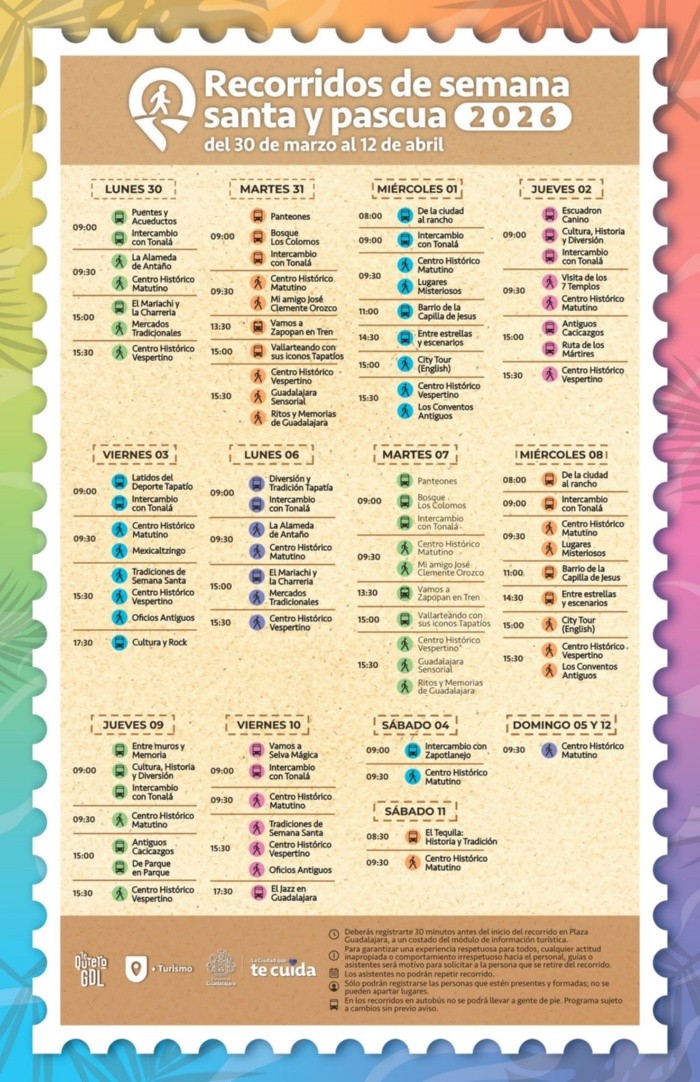 La Semana Santa es una época de conmemoraciones religiosas, pero también un periodo vacacional ideal para pasear y disfrutar del esparcimiento. Para quienes se quedan en Guadalajara durante estos días, hay diversas actividades gratuitas que también pueden disfrutar los visitantes, ya que la ciudad es un destino turístico en sí misma.La Agencia Metropolitana de Bosques Urbanos cuenta con 13 espacios recreativos donde se realizan distintas actividades. Durante la Semana Santa y Pascua, todos estarán abiertos al público con acceso gratuito.Este último cuenta con rutas ciclistas, por lo que es posible practicar este deporte o disfrutar en familia de la naturaleza, aunque existen restricciones por motivos de seguridad y protección de la flora y fauna.El Gobierno de Guadalajara ofrece, del 30 de marzo al 13 de abril, recorridos turísticos que parten desde la Plaza Guadalajara.Las actividades no tienen costo, pero se recomienda acudir al menos 30 minutos antes para realizar el registro.Agenda para este fin de semana:Viernes 3A través de la iniciativa Cinema Live, se proyectarán películas en parques públicos de la ciudad.Viernes 3Mi amigo robot, en el Parque Alcalde, a las 19:45 horasSábado 4Operación Cacahuate, en el Parque Metropolitano, a las 19:45 horasDomingo 5Oddball, en el Parque de los Niños y Niñas, a las 19:30 horas Museos y otros atractivosOtra opción para disfrutar la ciudad es visitar museos, plazas y templos del municipio. Entre ellos destacan el Museo de Paleontología, el Museo de Cera, el Instituto Cultural Cabañas —que alberga murales de José Clemente Orozco—, el Museo de las Artes (MUSA) de la Universidad de Guadalajara, el Globo Museo del Niño, el Museo del Periodismo y las Artes Gráficas (MUPAG), el Panteón de Belén y el Museo Raúl Anguiano (MURA).Estos espacios permanecerán abiertos durante la Semana Santa.