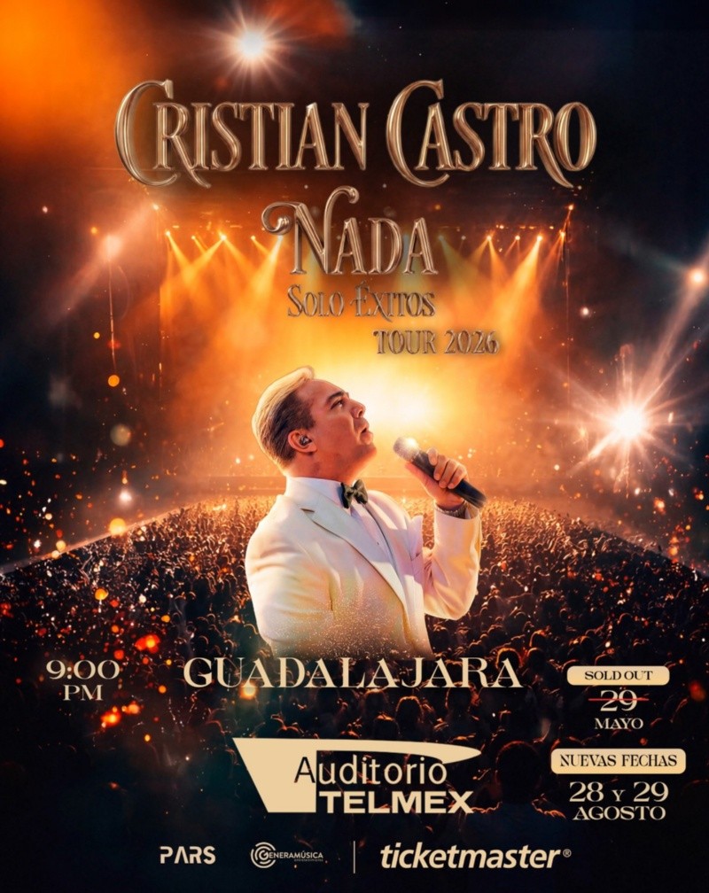 Cristian Castro anunció dos nuevas fechas para Guadalajara programados para el 28 y 29 de agosto en el Auditorio Telmex, presentaciones que se integran a su gira Nada. Solo éxitos Tour , luego de que la primera fecha (29 de mayo) anunciada en la ciudad registrara localidades agotadas.El espectáculo reúne canciones que han acompañado la trayectoria del cantante a lo largo de más de tres décadas de carrera. El repertorio incluye temas como “Azul”, “Lloran las rosas”, “No podrás”, “Volver a amar” y “Por amarte así”, piezas que forman parte de su catálogo musical y que han mantenido presencia en escenarios de México, Latinoamérica y Estados Unidos.La gira plantea un formato enfocado en la interpretación de sus canciones más conocidas, con una producción diseñada para el formato en vivo y centrada en el recorrido musical del artista. El proyecto funciona como un repaso por distintas etapas de su carrera, construida a partir de discos que han alcanzado certificaciones multiplatino.Los boletos estarán disponibles a través de Ticketmaster y en las taquillas del recinto. La venta general iniciará el 25 de marzo a las 11:00 horas.Los precios anunciados para las funciones contemplan distintas zonas del recinto: VIP en 3,950 pesos; zona roja en 3,650; azul en 2,950; verde en 2,500; blanca en 1,950; lila en 1,550; naranja en 950 y amarilla en 750 pesos. SV