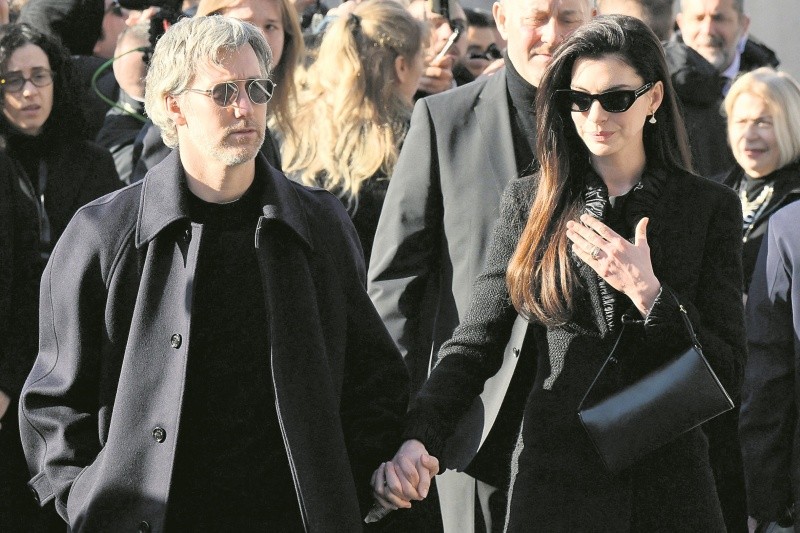Adam Shulman y Anne Hathaway llegaron al funeral del diseñador italiano. AFP