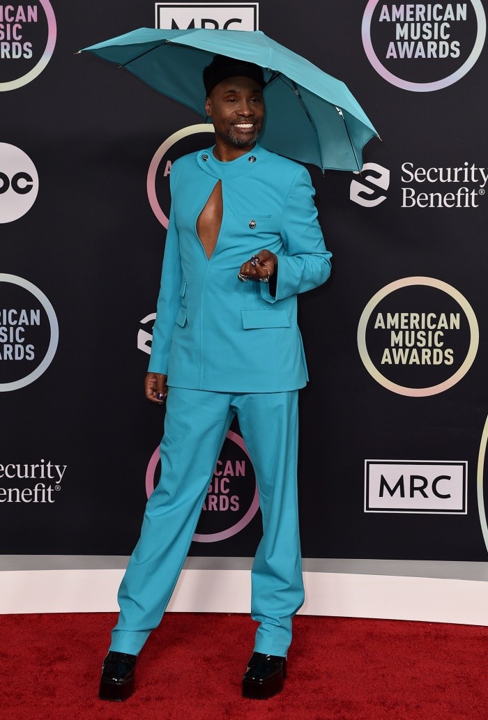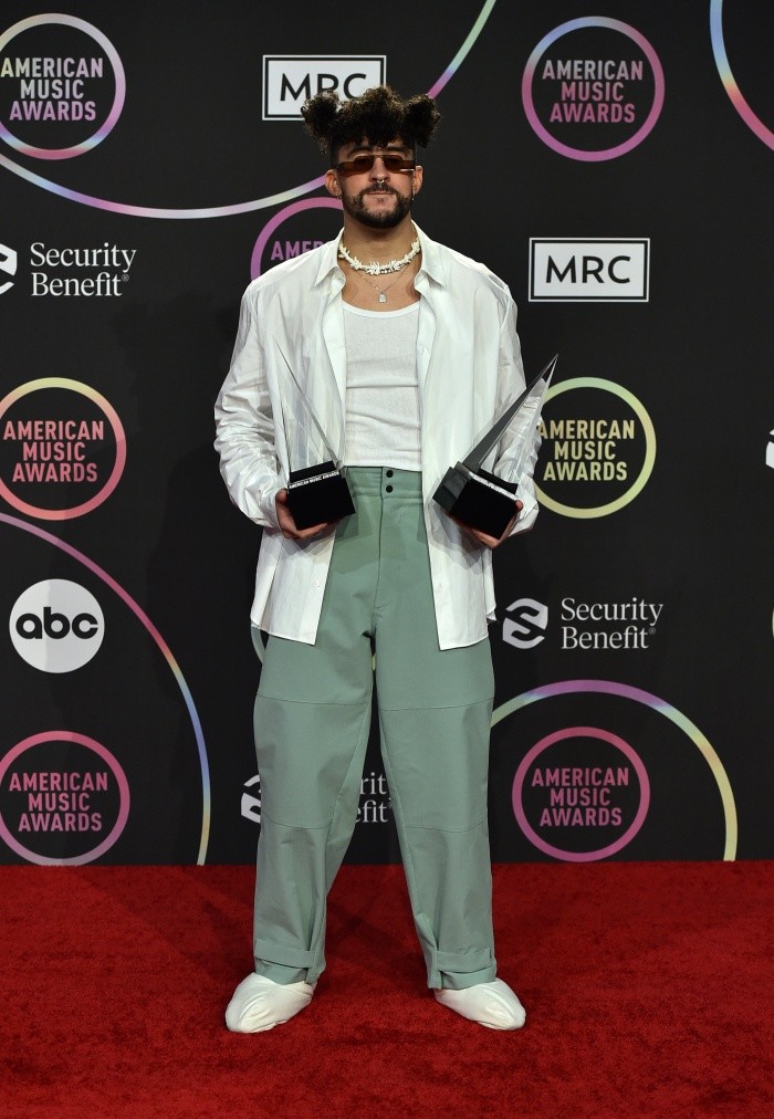 La 49 edición de los American Music Awards tuvo lugar este domingo en el Microsoft Theatre de Los Ángeles, reconociendo a los artistas, álbumes y canciones más escuchados del 2021. Con la rapera Cardi B como anfitriona no fue de sorprenderse que la alfombra roja previa al evento contara con propuestas de moda surrealistas que al instante se volvieran virales en redes sociales. Después de casi un año de pandemia en el que las premiaciones se llevaron a cabo a distancia y la mayoría de los artistas recibieran sus premios desde la comodidad de su casa utilizando ropa casual, las alfombras rojas presenciales vuelven a ser un hecho y, como todos los años, todo un tema de conversación.Encabezando el listado de looks extravagantes no podría estar otra persona más que la rapera Cardi B, quien lució un vestido negro con escote corazón firmado por Schiaparelli. Sin embargo, lo que más llamó la atención y añadió ese toque surrealista por el que tanto se distinguen tanto la firma italiana como la misma rapera, fue la impresionante máscara dorada estilo ópera con la que cubrió su rostro mientras posó en la mediática alfombra roja y combinó con largas uñas doradas que sobresalían de sus guantes y un par de aretes igual de surrealistas y extravagantes.Aunque el look de Billy Porter en los American Music Awards 2021 fue quizás uno de los más conservadores con el que ha asistido a alguna alfombra roja en el último par de años, su traje azul con escote, sombrero tipo paraguas y sus ya obligatorias uñas decoradas con pedrería lo siguen posicionando como una de las celebridades más comentadas en las red carpet.El puertorriqueño Bad Bunny fue otro de los indudables protagonistas de la noche, no solamente por haber ganado los premios a "Artista Latino Masculino Favorito" y "Álbum Latino Favorito", si no por haber vestido -una vez más- un look extravagante que supera a cualquier otro que haya usado antes. El intérprete de "DÁKITI" llevó un outfit fuera del molde de los pies a la cabeza, y los que sin duda fueron los zapatos más comentados de la noche. MR