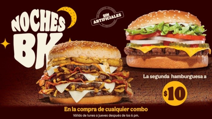 La famosa cadena de comida rápida, Burger King anunció una increíble promoción en la cual pone sus hamburguesas a solo 10 pesos, sin embargo, tiene algunas condiciones, por lo que aquí te contamos cómo y dónde aplicar dicha oferta.El nombre de la promoción es “Noches BK” la cual tiene como objetivo que ninguno de sus clientes se vaya a dormir sin cenar una deliciosa hamburguesa.Burger King detalló que para hacer válida la promoción de hamburguesas a 10 pesos, los consumidores deberán acudir a cualquiera de sus sucursales de la República Méxicana y comprar cualquier combo que se encuentre disponible.Antes de finalizar su pedido, los consumidores podrán hacer el pago de 10 pesos adicionales y agregar una de las hamburguesas individuales participantes siempre que sean de un precio menor a la seleccionada en el combo.Es decir compras cualquier combo y por 10 pesos más te llevas una hamburguesa individual.Cabe destacar que la promoción comenzó desde el pasado 29 de enero y estará vigente hasta el 31 de diciembre de 2024, pero solamente de lunes a jueves, después de las 6:00 pm hasta el cierre de las sucursales. Además , por $39 pesos más, agrega a tu segunda hamburguesa unas papas chicas más un refresco chico.Finalmente, cabe destacar que la promoción sólo es válida en compras físicas de las sucursales de Burger King, no aplica en servicio a domicilio ni en aplicaciones de entrega de comida.La promoción estará sujeta a la disponibilidad de los productos relacionados en las sucursales Burger King y aunque en el sitio oficial de la empresa dice que la vigencia es hasta el 31 de diciembre de 2024, se señala que la presente promoción podrá ser suspendida, cancelada o modificada por el Organizador en forma total o parcial, pero tranquilo, eso no ha pasado, por lo que puedes ir a comprar tu hamburguesa por solo 10 pesos.NA