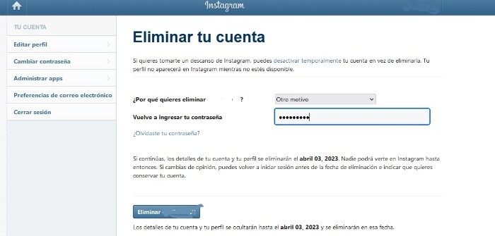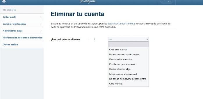 Tener una cuenta de redes sociales puede ser divertido y nos ayuda en ocasiones con ideas para decorar, vestirnos, o celebrar. Sin embargo, a veces también puede cansarnos o dejamos de utilizarla, y decidimos eliminar permanentemente una cuenta.Aquí te decimos cómo borrar un perfil de Instagram para siempre.El método para borrar una cuenta de Instagram es bastante sencillo a comparación de otras redes sociales. Sólo tienes que ingresar en el enlace www.instagram.com/accounts/remove/request/permanent/ en navegador y con la sesión abierta de la cuenta que quieres eliminar.Posteriormente, tendrás que decirle a Instagram la razón por la que no quieres usar más esa cuenta. En la pantalla se desplegará la pregunta "¿Por qué quieres eliminar tu cuenta?", junto con varias opciones, de las que debes seleccionar una.Dependiendo de tu respuesta, Instagram te ofrecerá una serie de opciones en un intento por mantener tu cuenta. En caso de que no quiera seguir, aparecerá un cuadro en el que tienes que introducir tu contraseña para verificar que el dueño sea quien está eliminando la cuenta.Una vez que agregar tu contraseña, da click en Eliminar. Al final, te aparecerá en pantalla un mensaje de confirmación.En caso de que te arrepientas, tienes un periodo de 30 días para volver a entrar en tu cuenta y así se reactivará de manera automática; pasado este lapso, la cuenta desaparecerá.Considera guardar todos tus archivos como fotos o videos de tu cuenta antes de decidir eliminarla, pues una vez que esto ocurra no podrás recuperarlos, pues los datos de la sesión se borrarán de manera permanente.OF