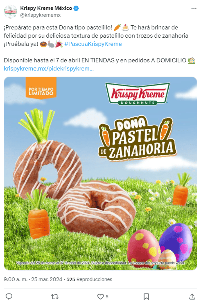 La Pascua está cada vez más cerca, por lo que Krispy Kreme lanzó una nueva dona sabor pastel de zanahoria.Las donas estarán por tiempo limitado, a partir de este lunes 25 de marzo al 7 siete de abril, y puedes pedirlas tanto en tiendas como a domicilio. De acuerdo con la cadena de donas te promete una experiencia que te hará “brincar de felicidad”Sin embargo, de acuerdo con perfil de X, antes Twitter de Krispy Kreme, estará disponible hasta el siete de abril en tiendas y en pedidos a domicilio, a pesar que su vigencia dice desde el 25 de marzo. La docena de donas sabor pastel de zanahoria tiene un precio de 379 pesos y la media docena, 279 pesos.Además, tal como su nombre lo dice, estas donas tienen como base la receta tradicional del pastel de zanahoria, con una masa suave y esponjosa. Por lo que puedes aprovechar estos días para ir por tu media o completa docena, y obtener un delicioso postre de Pascua. NA