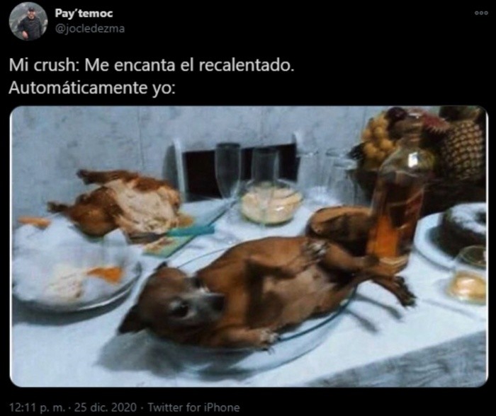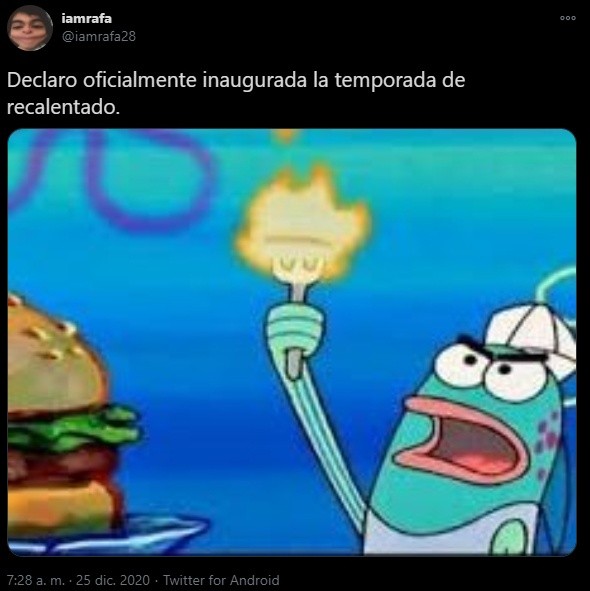 Definitivamente, el recalentado de Navidad es un momento especial en la que las familias se vuelven a reunir para compartir experiencias tras las celebraciones de Nochebuena, y además, un buen pretexto para continuar con la degustación de la comida que sobrevivió de la noche anterior.Como cada 25 de diciembre, usuarios en redes sociales han hecho públicos en redes sociales los mejores memes para hablar de esta singular, tradición favorita para muchos en estas fechas decembrinas.