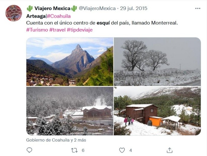 Si siempre te ha llamado la atención esquiar, pero no quieres salir del país, hoy te contamos por qué este destino turístico de México es la mejor opción para hacerlo.Estamos hablando de Arteaga, Coahuila, un Pueblo Mágico en el que, además de esquiar, también podrás hospedarte en cabañas en el bosque, hacer alguna caminata, jugar golf, ver escalofriantes momias y admirar la belleza de la Sierra Madre Oriental.Uno de los destinos más solicitados de Arteaga es la pista de esquí artificial: está abierta todo el año y pueden entrar tanto niños como adultos.Ubicada en el complejo turístico de Bosques de Monterreal, es una de las razones para llamar a Arteaga "La Suiza mexicana". La pista de esquí tiene una longitud de casi 200 metros y un declive que la hace algo extrema para principiantes; termina frente a la terraza del restaurante, en medio de un bosque de pinos.Si no sabes esquiar, los organizadores ofrecen varios paquetes que incluyen varias lecciones de esquí, tanto privadas como en grupo o para niños.Ponte atento. Si crees que eres capaz de deslizarte por la pendiente sin haberlo hecho nunca antes, pero el patrullero evalúa que no estás preparado, se te pedirá que salgas de la pista por tu seguridad y la de los demás.330 pesos 1 adulto por 1 hora Sin instructor ni renta de equipo245 pesos 1 niño por 1 hora Sin instructor ni renta de equipo495 pesos 1 adulto por 1 hora Sólo renta de equipo385 pesos 1 niño por 1 hora Sólo renta de equipo750 pesos 1 adulto y 1 niño por 1 hora Instructor y renta de equipo650 pesos Adulto y niño por 1 hora Instructor para cuatro personas sin renta de equipoSu atractivo principal es el ecoturismo. Arteaga está situado entre las montañas de La Viga y La Siberia, en las que podrás practicar senderismo, avistamiento de aves y paseos a caballo para ver la majestuosidad del paisaje serrano.Si te inclinas por los deportes extremos, también es posible descender a rappel y hacer ciclismo de montaña.Otros de los atractivos que hay que visitar sí o sí en Arteaga son el Templo de San Isidro Labrador de las Palomas, los Bosques de Monterreal, la Carbonera los Lirios y El Tunal.Las mejores temporadas para visitar Arteaga, en el municipio de Coahuila, son verano e invierno. Cuando hace calor se llega a los 28 y 30 grados, temperatura ideal para practicar deportes de aventura. En invierno llega a nevar.Si te gustan las fiestas tradicionales, el 15 de mayo es el Día de San Isidro Labrador, patrono de las lluvias, al que celebran con música, danzas y una feria completa.También está la Feria de la Manzana, que se celebra en septiembre. Arteaga es un gran productor de manzana, membrillo y durazno con los que se elaboran licores y dulces.Pero antes de hablar de los postres tenemos que pasar por los platos fuertes que puedes disfrutar en Arteaga. La oferta gastronómica incluye tradicionales enchiladas y carnitas de cristal.Para acompañar puedes beber de los famosos licores de frutas y vinos coahuilenses, cada vez mejor posicionados en la industria vitivinícola.Ubicado a sólo 20 minutos de la capital, Saltillo, este bellísimo Pueblo Mágico está al oeste del estado de Coahuila. Limita al norte con el municipio de Ocampo y al sur con el de Francisco I. Madero.JM