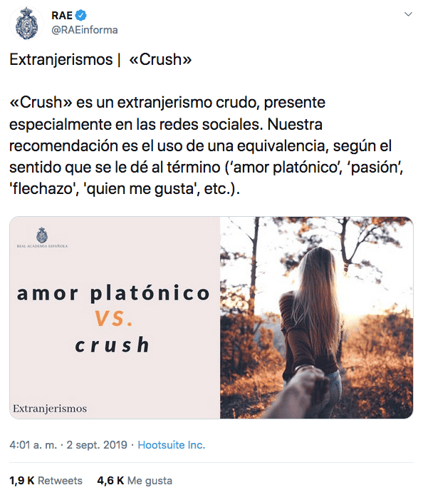 La cuenta oficial de Twitter de la Real Academia Española señaló en la plataforma que es incorrecto utilizar el extranjerismo "crush" para referirse a un amor platónico o imposible, y recomienda en su lugar utilizar un equivalente en nuestro idioma.La institución propone en su lugar usarse una equivalencia según el sentido que se le dé al término, por ejemplo flechazo, pasión, amor platónico o quien me gusta.Debido a que no existe una traducción exacta del término "crush", la RAE da varias opciones para diferentes situaciones, lo que provocó disgustos y burlas de usuarios de Twitter quienes proponen seguir utilizando el anglicismo.La palabra "crush" puede usarse tanto para amores posibles como imposibles; así como tu compañero que te gustaba en la secundaria puede ser tu "crush", el actor Jake Gyllenhall puede serlo también. ¿Quién es tu crush? ***Sigue leyendo…Si te interesó esta noticia y quieres saber más, entonces descarga y descubre INFORMAPlus, la aplicación digital de EL INFORMADOR, en donde tenemos contenidos exclusivos, seleccionados por nuestros editores, para darles una experiencia más completa a los lectores.Descarga la aplicación y pruébala GRATIS por treinta días.Para iOS: https://apple.co/35jaVgbPara Android: https://bit.ly/3gwVSEVSi eres suscriptor de EL INFORMADOR tu acceso está incluido, solicítalo al 33 3678-7777 MR