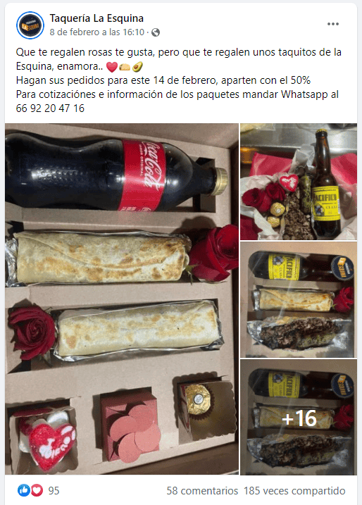 Que “el amor entra por el estómago” se ha convertido en una oportuna estrategia por el Día de San Valentín que un negocio de Mazatlán, Sinaloa puso en marcha y que en las redes sociales ya se vuelve viral, pues ofrece cajas de regalo que incluyen flores, chocolates y tacos.Fue a través de la página de Facebook de un negocio llamado “Taquería La Esquina” que se dio a conocer la oferta de productos especial para el mes de febrero, que incluye una variedad de empaques idóneos para incluir, además de chocolates, flores o detalles propios de la fecha, algunos estelares de su menú.“Que te regalen rosas te gusta, pero que te regalen unos taquitos de La Esquina, enamora…” asegura el establecimiento en su publicación, la cual incluye una serie de fotografías de las cajas de regalo que ofrecen para el 14 de febrero, las cuales se pueden apartar con el 50% de anticipo y deben solicitarse mediante la aplicación de mensajería WhatsApp.Entre los paquetes que ofrece la taquería destacan, uno con refresco, dos burritos, dos rosas, un chocolate, un postre y otra pequeña sorpresa; una variante de este empaque incluye una cerveza en vez de refresco y una orden de carne junto con un burrito. Existe además un paquete de tacos que se empaca en una caja en forma de corazón.La publicación se ha compartido decenas de veces y acumula también decenas de comentarios que solicitan más información sobre los precios de los originales y deliciosos paquetes disponibles para el Día de San Valentín como una verdadera opción que sin duda encantará a muchas personas entusiastas del máximo platillo mexicano.
