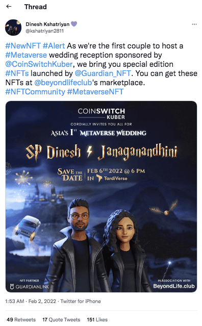 La boda de una joven pareja de la India realizada hace apenas unos días en el metaverso, a través de la plataforma TardiVerse, no sólo fue mágica, sino que refrenda la relevancia interpersonal que definitivamente ya asentó el mundo virtual. Dinesh Sivakumar de 24 años y Janaganandhini Ramaswamy de 23, contrajeron nupcias el pasado 6 de febrero, desde Tamil Nadu, en la India, con la peculiaridad de realizar la primera boda en el metaverso con todo y temática del mundo de Harry Potter. Ante las limitaciones en bodas de un máximo de 100 invitados para evitar contagios de Covid-19 en Namil Nadu, la pareja decidió hacerla virtualmente con la duración de una hora. Si bien la celebración se convirtió en tema internacional, no fue completamente virtual pues las leyes de la India, como en muchas otras naciones, exigen que para oficializar un casamiento, los contrayentes deben estar físicamente en la ceremonia. De esta manera, la pareja tuvo primero una boda intima y después el magno evento en el metaverso, nada más y nada menos que en el colegio británico de Magia y Hechicería, Hogwarts, lugar ficticio donde se desarrolla la mayor parte de las novelas de J. K Rowling.CP