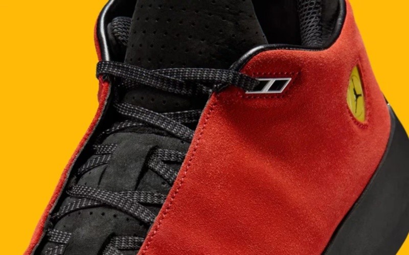 El logo “Jumpman” aparece en la lengüeta y en un costado del zapato, enmarcado en un escudo amarillo que sustituye al tradicional “Cavallino Rampante” de Ferrari.