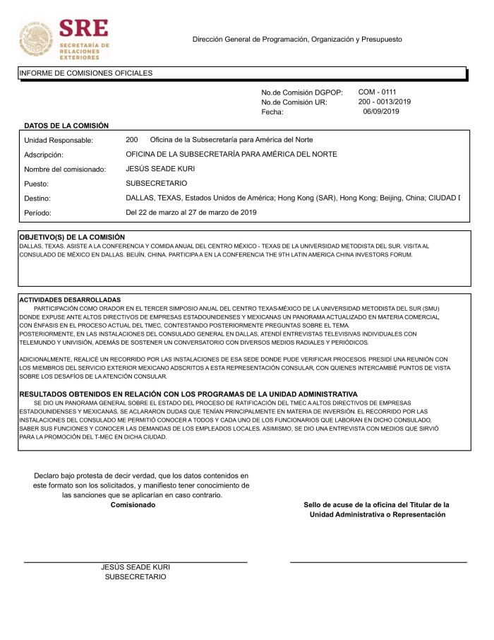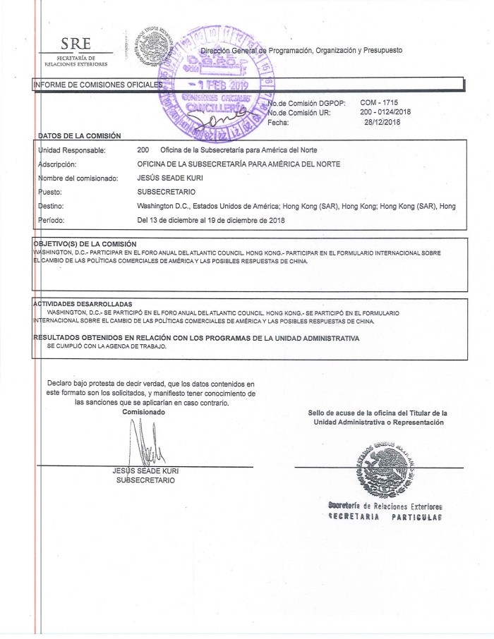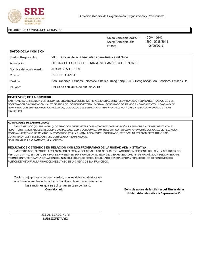 En medio de la mayor tragedia sanitaria y económica, el subsecretario para América del Norte de la cancillería mexicana, el doctor Jesús Seade Kuri, se la vive en Hong Kong.Si la orden es “quédate en casa”, Seade la acató sin miramientos: desde hace más de una década, su casa está en Hong Kong. A 13 mil kilómetros de su oficina en la Ciudad de México. Y en lo que va de este año, ha pasado largas temporadas en esa ciudad china, según me confirman distintas fuentes oficiales en la Secretaría de Relaciones Exteriores. “Se da sus vueltas a México, como patrón de hacienda”, resume un alto funcionario indignado.Así que mientras México negocia con Estados Unidos la reactivación coordinada de las cadenas de producción tras el cierre obligado por la pandemia, mientras México cabildea con Estados Unidos la provisión de ventiladores para quienes corren riesgo de muerte por el coronavirus, mientras Estados Unidos anuncia que el 1 de julio empieza a operar el TMEC, el subsecretario encargado de la relación internacional más importante y estratégica del gobierno está ausente, lejano, políticamente inexistente.En la Secretaría de Relaciones Exteriores (SRE) se sabe que Hong Kong es el lugar al que Seade llama “hogar”. Se estableció allá desde el año 2007 y ha tenido diversos empleos en esa moderna ciudad que pelea por su independencia del gobierno central chino. El subsecretario Seade Kuri ha implementado el “home-office” desde antes que fuera una recomendación oficial: él trabaja desde Hong Kong. Y no es la primera vez que se descubre:A principios de febrero, cuando empezaron las restricciones de vuelos por la pandemia, le revelé que el doctor Seade había quedado atrapado en Hong Kong. Él lo tuvo que aceptar públicamente. Funcionarios de la Cancillería mexicana trabajaron arduamente para tratar de conseguirle un vuelo que lo sacara de ahí. Surgió de inmediato el cuestionamiento: ¿qué hace el subsecretario para América del Norte en Hong Kong? Él, que no había revelado nada de su supuesto viaje de trabajo, se vio orillado a declarar que se había reunido con el “círculo financiero” local para explicarles las oportunidades de inversión que representaba México con el T-MEC.Cuando estalló el tema del cierre de la frontera terrestre México-Estados Unidos por impulso de Trump, a mediados de marzo, ¿dónde estaba Seade? ¡En Hong Kong!De hecho, la última aparición pública de Seade en México, según el registro oficial de la cancillería, data del 5 de marzo (hace casi dos meses) cuando se reunió con senadores. El 17 de marzo (diez días antes de la entrada en vigor del “quédate en casa”), el canciller Ebrard tuvo una reunión vía internet con los embajadores y cónsules de Estados Unidos yCanadá, los países de América del Norte. En la fotografía que publicó en Twitter hay varios funcionarios atendiendo presencialmente el encuentro desde una sala de juntas de la SRE. Seade no está entre ellos: se conectó por teléfono.Las notables ausencias del subsecretario Seade no son sólo de este año.Cuando reventó la crisis de la amenaza de Trump de poner aranceles, el subsecretario fue un rato a Washington… ¡y de ahí voló a Líbano! “En el Día-D no estuvo ahí”, me comenta una fuente. El viaje de Seade dejó boquiabierta a la de por sí estrecha delegación mexicana enviada a resolver el problemón. Este viaje está documentado en el portal de Transparencia de la SRE: Fue la comisión 0487 UR: 200 – 0065/2019 del 2 al 13 de junio del 2019, y ahí especifica que el destino inicial es Washington, que de ahí vuela a Beirut y luego regresa a la Ciudad de México. En ese momento crítico para la relación México-EEUU, Seade Kuri justifica en el documento oficial que fue a Líbano a participar como orador en una cena y a dar cuatro conferencias.Del 13 al 19 de diciembre del 2018 la comisión COM 1716 UR: 200-0124/2018 señala que voló a Washington D.C. y de ahí a Hong Kong.Del 22 al 27 de marzo de 2019, según consta en el Informe de Comisiones Oficiales 0111 UR 200-0013-2019 fue a Dallas, de ahí a Hong Kong, luego a Beijing y de regreso a México.A los quince días, del 13 al 24 de abril de 2019 el documento de comisión 0163 UR: 200 – 0035/2019 le autoriza el viaje a Washington, de ahí a Hong Kong, luego a San Francisco, California, y a la Ciudad de México.A estas alturas, muchos funcionarios de la Secretaría de Relaciones Exteriores están hartos y enojados con la desaparición del subsecretario. La Subsecretaría de América del Norte solía ser la más importante de todas, una máquina bien aceitada en la que se consideraba un honor trabajar. Ha perdido prestigio.Ojalá esta columna sirva para transparentar el número de viajes que ha hecho el subsecretario a Hong Kong, el número de días que ha pasado ahí, su justificación, el gasto que ha representado en vuelos y viáticos, así como la explicación de si así funciona el funcionario.