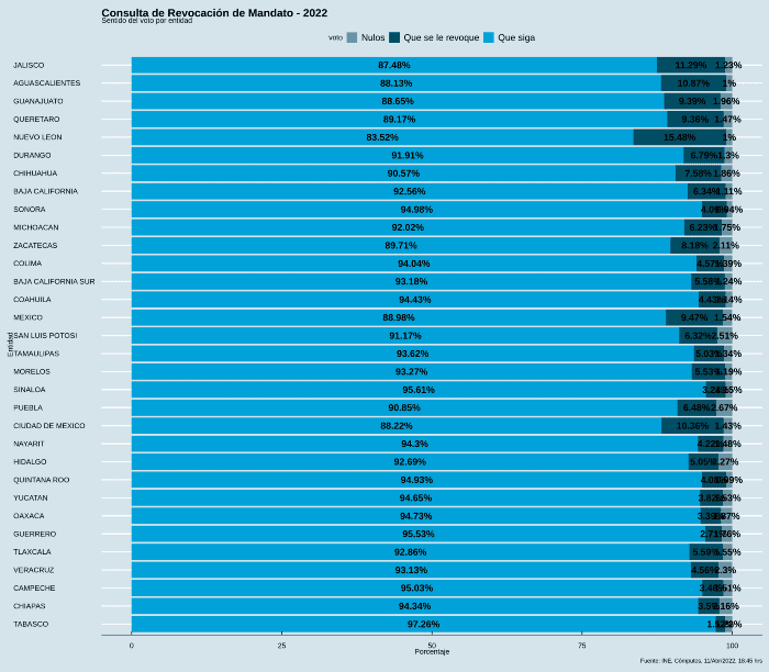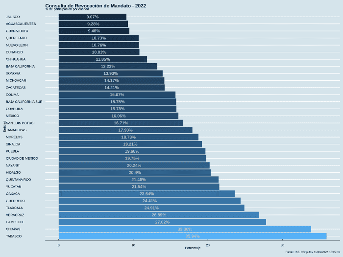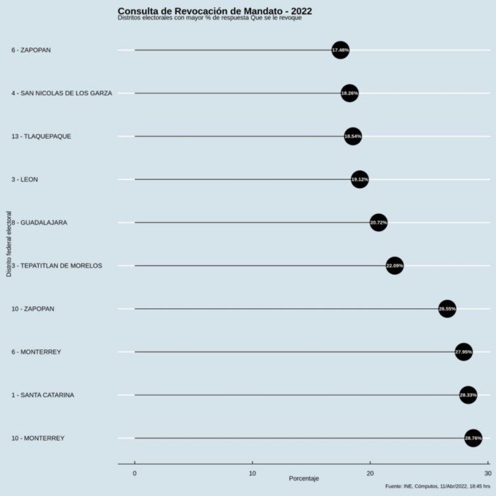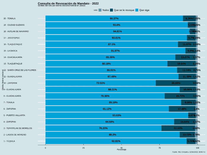 Poco más de medio millón de personas que viven en Jalisco salieron a votar durante la consulta de revocación de mandato realizada el pasado domingo. Como en otros estados, ganó por 9 a 1 la opción “Que siga” sobre la respuesta “Que se le revoque”. Hasta ahí, digamos, no hay ninguna novedad o característica particular de lo ocurrido en la consulta con respecto a otros estados. Sin embargo, si revisamos los datos detalladamente, podemos observar rasgos específicos que sin llegar a ser conclusiones, sirven para detonar el análisis y la discusión.A continuación, presento una serie de gráficos que nos permitirán observar algunos detalles de lo que ocurrió en Jalisco.Jalisco fue el estado con menor participación de todo el país. La primera pregunta que surge es si se debe al buen trabajo político y de gobierno de Movimiento Ciudadano, pero existen datos que nos llevan a pensar en un “no” como respuesta. La consulta sobre el Pacto Fiscal en Jalisco tuvo menos participación que la de revocación de mandato, con 555 mil 899 votos sobre 388 mil 816. Además, el gobernador está entre los 10 peor evaluados en México. En síntesis, ser antilopezobradorista no es sinónimo de ser pro Enrique Alfaro.Ahora veamos el sentido del voto. Un total de 11.29% de los jaliscienses que acudieron a la consulta pidieron la revocación de mandato. Es la segunda entidad con la cifra más alta en este rubro, sólo después de Nuevo León. Ambas entidades son gobernadas por Movimiento Ciudadano, pero tampoco podemos considerar esta como una característica influyente en el sentido del voto, pues otros estados como Aguascalientes, Guanajuato y Querétaro (gobernados por otros partidos) también están en el top donde más se pidió la revocación de mandato. Entonces, se trata de estados conservadores, donde la izquierda no ha tenido presencia históricamente. Bien, ¿qué ocurrió en las regiones de Jalisco? En 20 distritos federales hubo una abstención de entre el 86.9% y el 95.51%. Municipios del norte y Zapopan, donde más abstencionismo hubo. Es decir, una zona conservadora y otra de alto poder adquisitivo, en general. Lugares donde las presidencias municipales se reparten entre varios partidos, no sólo son para Movimiento Ciudadano.Este mapa nos permite apreciar que el sur de Jalisco es donde mayor influencia podría tener Morena, al ser la región donde mayor participación se registró el domingo. No obstante, es una zona donde Movimiento Ciudadano tiene mayor dominio en las presidencias municipales.La Zona Metropolitana de Guadalajara, donde domina Movimiento Ciudadano, es donde más se pidió la revocación del mandato del Presidente de la República, con un promedio de 17.91%, casi tres veces de lo que ocurrió a nivel nacional. De los 10 distritos federales con mayor porcentaje de votos por el “que se le revoque”, cuatro pertenecen a Jalisco y cuatro a Nuevo León. En otras palabras, 8 de los distritos más anti obradoristas son gobernados por Movimiento Ciudadano.