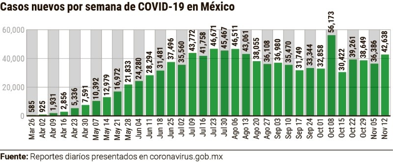 Para dar continuidad a la evolución de la pandemia, las gráficas que se presentan a continuación muestran los contagios que semana a semana se van dando; en primer lugar, tenemos los datos nacionales.Se observa que el 26 de marzo se tenían 585 casos confirmados en México, pero en la semana siguiente se contagiaron 925 adicionales y en la subsecuente 1,931 más, y así, sucesivamente hasta llegar a la cifra de 42,638 nuevos contagios en la semana más reciente.El número de contagios que había estado creciendo progresivamente, muestra una aparente tendencia a la baja a partir de la semana que concluye el 20 de agosto; sin embargo, en la semana de octubre 8 se consigna un registro desproporcionado. La explicación ofrecida por los voceros de la Secretaría de Salud fue que eran casos rezagados en los registros de las semanas anteriores.De tal forma que, si esa barra se distribuye proporcionalmente entre las barras anteriores, la tendencia aparentemente a la baja se diluye. Podemos entonces decir que, durante los 3 últimos meses, el número de contagios semanales ha sido de entre 35,000 y 40,000 de forma constante.Lo anterior refleja que ni hay tendencia a la baja, ni tampoco un rebrote (como lo ha llegado a decir López Gatell), sino que simplemente la ola de contagios persiste a un ritmo uniforme. En lo que respecta a Jalisco, existen 2 diferentes fuentes de información, la que consigna los datos reportados por el Gobierno Federal y otra con los datos del Gobierno del Estado.El Gobierno de Jalisco inició en abril la realización de pruebas diagnósticas, utilizando laboratorios privados y de la Universidad de Guadalajara. A partir de entonces, los casos positivos detectados en estos laboratorios se cuantifican en la estadística de estado y no en la federal. De acuerdo con la federación, en la entidad se han registrado 37,015 contagios acumulados, mientras que la estadística estatal reporta 102,165. En la gráfica de barras con los datos de Gobierno Federal se puede notar que en la semana más reciente se registraron 1,522 casos; es decir, que desde el mes de julio el número de contagios ha permanecido constante, aunque en la últimas semanas se registra una tendencia a la baja . En los datos del Gobierno Estatal, el crecimiento récord se dio en la última semana de octubre (6,208 casos); en las 2 semanas subsecuentes, la gráfica muestra una clara tendencia descendente.Lo anterior tiene una relación directa con el “Botón de Emergencia”, activado precisamente entre el 30 de octubre y el 13 de noviembre, y sería lógico esperar que la cifra se mantenga relativamente baja en las próximas 2 mediciones semanales; sin embargo, habrá que esperar el comportamiento después de la desactivación de las medidas restrictivas.Si la gente entiende que seguimos en medio de una pandemia, que hay que evitar los lugares concurridos y que cuando tenga que salir lo haga siguiendo todas las medidas sanitarias para cuidarse y cuidar a los demás, probablemente los números de las semanas subsecuentes seguirán bajando.Si, por el contrario, la gente interpreta que la desactivación del “Botón de Emergencia”, significa que la pandemia está superada y en consecuencia se olvida de las medidas de protección y distanciamiento, seguramente los datos de contagios se verán nuevamente al alza, sobre todo a fines de noviembre.Por el bien de todos, espero que haya conciencia y que la gente actúe responsablemente, aunque en el fondo tengo serias dudas de que esto suceda.