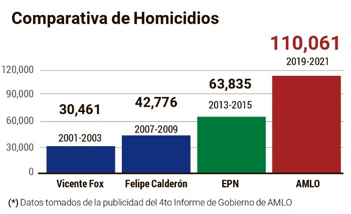 Durante los últimos días hemos recibido, a través de los distintos canales de televisión, un auténtico bombardeo de spots promocionales del Cuarto Informe de Gobierno del Presidente de México.En esta ocasión me voy a centrar en uno de ellos, en el cual se hace referencia a las cifras de homicidios a lo largo de los últimos sexenios, y concluye señalando que durante el actual gobierno estos han tenido una reducción del 10.4 por ciento.Para entender mejor la información presentada mediante este spot, sugiero subdividirla en tres partes:En la parte superior, debajo de las fotos de los mandatarios, aparecen las cifras de homicidios acumulados durante el sexenio respectivo. En el caso de AMLO, el dato corresponde a 3 años y seis meses.La información presentada dice que durante el gobierno de Fox ocurrieron 60 mil 280, durante el de Calderón 120 mil 563, durante el de Peña 156 mil 066 y durante lo transcurrido del actual 128 mil 152.Esos datos realmente no muestran una disminución ni una tendencia a la baja. Y sí, efectivamente los homicidios registrados en el sexenio anterior son superiores a los del actual, pero falta por transcurrir cerca de un 40% del sexenio. Por otro lado, podemos notar, que llevamos más homicidios en los tres años y medio de Gobierno de AMLO que en los seis años del Gobierno de Calderón.Así que, retomando los datos presentados en la parte superior, no se comprueba disminución alguna.Abajo se muestra una gráfica en la que cada barra corresponde al número de homicidios ocurridos durante un año, con excepción de la última que representa seis meses del presente año.Para hacer una comparación objetiva, se tomaron los datos de los tres primeros años de cada gestión y se elaboró la gráfica que acompaña el presente texto.La información no refleja disminución alguna, por el contrario, se ve un evidente incremento.Mientras qué, durante los tres primeros años de gobierno de Fox ocurrieron 30 mil 461 homicidios, durante los tres primeros años del Gobierno de AMLO la cifra ascendió a 110 mil 061.Finalmente, en la parte inferior de la imagen se registran unos datos porcentuales que se refieren a variaciones durante un período. Los datos correspondientes a las administraciones de los tres ex presidentes comparan la cifra de su primer año de Gobierno contra la del último año del sexenio; en el caso del Gobierno actual, la comparación se hace de junio de 2019 a junio de 2022. Es decir que se hace una comparación sobre parámetros distintos.Es en esa parte, con estos porcentajes que en realidad son irrelevantes, se pretende mostrar que los homicidios han disminuido un 10.4% durante la actual administración.Ciertamente en junio de 2022 se registraron menos casos que en junio del 2019, pero decir que por ello la tasa de homicidios se ha reducido en un 10.4% es poco convincente; sobre todo cuando sus mismos datos nos muestran que al comparar el primer trienio de Peña Nieto (63 mil 835) contra el primer trienio de AMLO (110 mil 061), el incremento es de 72.4 por ciento.