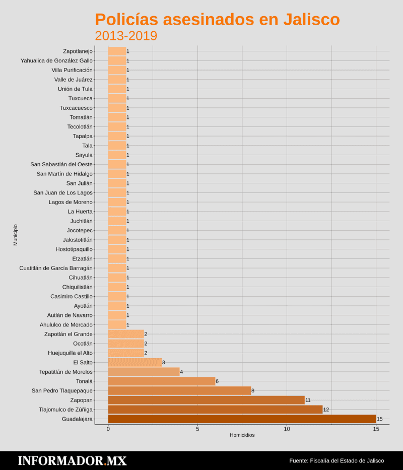 La sangre se puede contar. Y el conteo de 95 policías asesinados –cada cifra una vida– inició probablemente en Cuautitlán García Barragán en 2013. Aquel año asesinaron a un policía de ese municipio jalisciense. No hay registro noticioso del hecho. En cambio salta este titular en la pantalla: Los policías peor pagados de México ganan $2,380 pesos al mes (2016). Menos impuestos, claro. El artículo habla de los agentes de la policía municipal de Cuautitlán García Barragán, una demarcación atravesada por una ruta que conecta con el Puerto de Manzanillo y que el Cártel Nueva Generación usa para el trasiego de drogas.En total 95 policías han sido acribillados de 2013 a la fecha en Jalisco*. De esos, 71 eran municipales, 11 policías investigadores, el resto estatales y federales. ¿Eran buenos o malos policías? Ante el crimen organizado, ¿tuvieron que elegir plata o plomo? Son héroes o criminales uniformados. Una pregunta que muchos nos hacemos. Y una respuesta que la Fiscalía del Estado no tiene. No lo sabe porque en seis años sólo ha resuelto 7 homicidios de policías. El resto permanecen impunes; la autoridad no conoce al culpable, ni las razones del crimen. Significa que la Fiscalía estatal ni siquiera investiga los crímenes contra los suyos. ¿Qué esperar de un homicidio promedio? De hecho, podemos esperar lo mismo. En Jalisco se castigan sólo seis de cada 100 homicidios. A nivel nacional no es distinto. El problema incluso se ha acentuado en los últimos años, según el Índice Global de Impunidad IGI-México 2018.El fenómeno es generalizado en torno a cualquier ilícito. Supongamos que A comete un delito. Si B denuncia –en el 93% no lo hace por desconfianza– la autoridad no investiga. Por tanto A nunca es detenido. Ni procesado. Ni sometido a juicio. Ni obtiene sentencia. Ni va a prisión. Esa es la verdadera cadena que ata nuestra libertad: una cadena de impunidad.Apenas en marzo, el Congreso de Jalisco elevó la pena hasta 70 años de prisión por el asesinato de policías. Pero de qué sirve si a los homicidas no se les detiene ni procesa.Cuando uno se asoma a la realidad del policía en México, esto es lo que ve: un ciudadano como cualquier otro.También son padres de familia. Los estudios sobre el perfil del policía en el país señalan que ocho de cada 10 están casados y en promedio tienen dos hijos. La mitad está allí por vocación; el resto por necesidad. Más de la mitad se siente discriminado por la sociedad. De hecho, después del agente de tránsito y un juez, el policía municipal es al que la población percibe más corrupto. Un policía raso, el eslabón más débil, el último de la cadena, gana diez mil pesos al mes en promedio. Con ese sueldo, uno de cada dos costea su calzado. “Los uniformes y las botas que nos brinda la institución son de pésima calidad, se rompen en menos de 2 meses y son incómodas para el servicio”. En Jalisco, dos de cada 10 han sido amenazados por miembros del crimen organizado.El reciente asesinato de Arturo Gómez, Comisario de Tepatitlán, y su escolta, tiene altas probabilidades de engrosar un legajo que jamás llegará a sentencia. Lo mismo que los 238 homicidios de policías registrados este año en todo el país por el organismo Causa en Común.Sabemos mucho de la vida de un policía en México. Pero poco o nada sabemos de sus muertes. ¿Por qué los matan? Una pregunta que en el caso de Jalisco sólo la Fiscalía estatal podría responder si los niveles de impunidad no alcanzaran incluso a los suyos.*Nota: Las cifras de la Fiscalía del Estado de Jalisco difieren del conteo periodístico y del organismo Causa en Común sobre policías asesinados en el Estado y en México. Con esa salvedad, se aclara que para este artículo se utilizan los datos proporcionadas por la dependencia. Sin embargo, llama la atención la inconsistencia estadística de la autoridad, tema quizá de otro artículo..