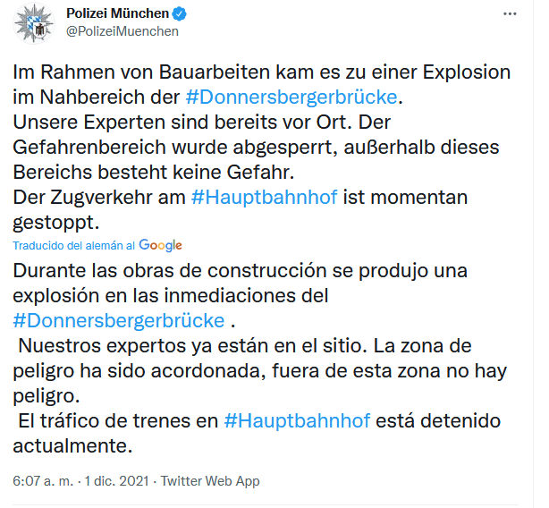 Este miércoles, la policía informó que la explosión de una bomba de la Segunda Guerra Mundial desenterrada durante unas obras en Múnich, Alemania, dejó tres heridos.El estallido ocurrió en unos trabajos que se realizaban en las vías del ferrocarril y fue escuchada a varios kilómetros de distancia, según el diario Bild, que precisó que una de las tres personas heridas está grave.El ministro del Interior bávaro Joachim Hermann declaró al diario que la causa de la explosión fue una bomba de la Segunda Guerra Mundial de 250 kilos de peso que se hallaba enterrada y fue alcanzada en el curso de unas prospecciones (desenterramiento)."Han volado escombros a varios cientos de metros de distancia. Toda la zona está siendo registrada en estos momentos," añadió Hermann.El tráfico ferroviario quedó interrumpido a consecuencia de la explosión y las fuerzas de seguridad acordonaron la zona, fuera de la cual no existe peligro para los transeúntes, según informó la Policía de Múnich en su cuenta de Twitter.La detonación se produjo pasadas las 12 horas locales en las inmediaciones del puente Donnersberger, cerca de la estación de trenes central de Múnich.Los operativos para desactivar las llamadas "bombas dormidas" lanzadas por los aliados en la II Guerra Mundial son relativamente frecuentes en Alemania y en ocasiones han conllevado evacuaciones masivas de residentes.El mayor operativo hasta ahora fue el realizado en 2016 en la ciudad de Augsburgo, cuando 54 mil vecinos se vieron obligadas temporalmente abandonar sus casas para desactivar una bomba británica.OF