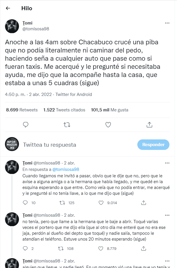 La discusión que una joven argentina tuvo con su pareja derivó en una historia que se volvió viral en Twitter, no por un lamentable desenlace, sino porque por fortuna, quien la acompañó a casa mostró una empatía y respeto admirables pese al estado en que se encontraba."Anoche a las 4am sobre Chacabuco crucé una piba que no podía literalmente ni caminar del pedo, haciendo seña a cualquier auto que pase como si fueran taxis", comienza en su relato el usuario Tomi (@tomisosa98) en un hilo de Twitter el pasado 2 de abril de 2022.En su relato, Tomi da a conocer la complicada situación a la que se enfrentó en la madrugada anterior con la joven que necesitaba llegar a su casa y nadie se detenía a ayudarla. "Me acerqué y le pregunté si necesitaba ayuda, me dijo que la acompañe hasta la casa, que estaba a 5 cuadras", explica.Mediante diversos tuits, comparte que la joven a la que ayudó logró dar con su domicilio, aunque con una serie de inconvenientes entre los que destaca no encontrar la llave del edificio, problemas con la puerta del elevador y la búsqueda de una de sus familiares para garantizar que llegara con bien hasta su departamento."Estuve unos 20 minutos esperando alguien que llegue, y nadie llegó. En un momento vio una llave que yo tenía y me la pidió, pero le dije que era mía, y le volví a preguntar si no tenía la suya en su cartera, hasta que se avivó y revisó, y si la tenía", explica el usuario de Twitter quien se mantuvo en la puerta del edificio para que no le ocurriera algo malo.Pese al estado inconveniente de la joven, esta logró llegar hasta su hogar gracias a la ayuda que el extraño le había brindado en la calle. Incluso al día siguiente el hombre que la ayudó recordó que entre los nombres que le había indicado la mujer para que bajaran por ella estaba el de su hermana, dando con su cuenta en Instagram y poniéndose en contacto para saber si se encontraba con bien."No te das una idea lo que te agradezco. Si ni siquiera cerró la puerta del depto (sic) jaja recién la cerré", le respondió la hermana de la joven a la que había ayudado; Tomi además comparte que quisieron ofrecerle dinero tras el gesto que tuvo, pero que decidió acompañarla “porque locos hay por todos lados”.Según la conversación que mantuvo con la hermana de la joven, ella y su pareja habían discutido y este se marchó del lugar pese a la condición en que se encontraba: “No hay pelea que justifique dejar que otra persona se vaya sola y menos en ese estado”.El hilo en Twitter rápidamente se volvió viral y el usuario reconoció que no esperaba que eso sucediera, llamando a cuidarse entre todos y agradeciendo a quienes reconocieron que gracias a él esta historia haya tenido un final feliz.RG