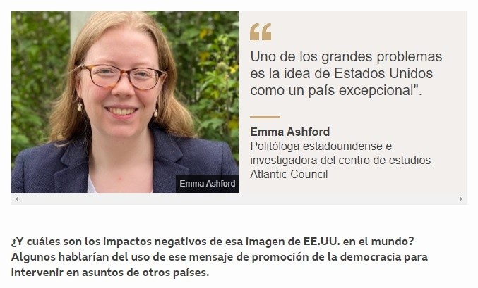 Un Capitolio fuertemente cercado y custodiado por la Guardia Nacional en los días finales de la presidencia de Donald Trump.Es la imagen que le llega al mundo del corazón político de Estados Unidos, cuya democracia es considerada la más vieja del mundo.Después del asalto a la sede del Congreso, el pasado 6 de enero en Washington D.C., por una turba de seguidores del presidente, Donald Trump, la capital ha recurrido a una vigilancia fuerte que pueda parar cualquier brote violento.Con Trump negándose a asistir a la toma de posesión de Joe Biden, el FBI buscando a los responsables de invadir el Capitolio y la Cámara de Representantes presionando al vicepresidente para provocar la renuncia de Trump, Estados Unidos parece sumido en la crisis.¿Es posible, entonces, que Estados Unidos siga promoviendo su imagen de ejemplo demócrata ante el mundo?Especialistas en política exterior como la estadounidense Emma Ashford, creen que es imposible sin que se resuelva el agudo conflicto político interno."No es posible construir una coalición de democracia para promover los derechos humanos y valores liberales si no puedes hacer eso mismo en tu propio país", dice la politóloga e investigadora del centro de estudios estadounidense Atlantic Council.Ashford cuestiona si la élite que diseña la política exterior de EE.UU. se está haciendo la pregunta sobre cómo dar lecciones al mundo a partir de una democracia herida. Y si los planes de Biden de "restaurar el liderazgo digno del país en el escenario mundial" son realistas.Lo que sigue es una entrevista telefónica con Ashford, resumida y editada para mayor claridad.---------------------------------------------------------------------------------------------------------------------Después de ver estos eventos de la semana pasada en EE.UU., no solo el asalto al Capitolio, sino el acto de varios legisladores de rebelarse contra los resultados electorales y la negativa de Trump de asistir a la toma de posesión de Biden, ¿cómo todo esto afecta el rol y la imagen de Estados Unidos en el mundo?Obviamente daña la imagen de Estados Unidos. Los últimos cuatro años han sido muy negativos para la imagen del país, aunque tampoco hay que decir que todo estaba perfecto antes de este periodo. Bajo el gobierno de Trump, la imagen del país ha sufrido.Creo que es más complicado descifrar lo que significa para el rol que tiene el país en el mundo. Ha habido un debate en Washington sobre si los eventos de la semana pasada significan que EE.UU. debería enfocarse en sus asuntos internos o en su política exterior.Desde mi punto de vista, creo que es realmente el momento para poner el foco sobre lo que está pasando internamente. Es difícil ver cómo Estados Unidos puede promover la democracia o defender los derechos humanos en el exterior cuando nuestra imagen se ha dañado tanto con lo que ha pasado internamente.Estados Unidos se ha presentado por años como la imagen de una democracia estable y ha utilizado esto para promover la democracia en el extranjero. ¿Cuál ha sido el impacto de esto?En primer lugar, creo que es bueno aclarar que Estados Unidos nunca ha sido una democracia perfecta. Incluso durante la Guerra Fría, se les impedía votar a los afroestadounidenses.Pero ha servido como inspiración para muchos alrededor del mundo para alcanzar sus propias metas democráticas o mejorar su historial de derechos humanos.Eso no significa que EE.UU. siempre ha sido útil; hay lugares donde la participación del país ha causado un daño profundo a esas causas democráticas.Pero el sistema bajo el que funciona EE.UU. ha sido a menudo visto como un ejemplo.¿Y cuáles son los impactos negativos de esa imagen de EE.UU. en el mundo? Algunos hablarían del uso de ese mensaje de promoción de la democracia para intervenir en asuntos de otros países.Este es uno de los grandes problemas, la idea de Estados Unidos como un país excepcional. Creo que eso ha permitido que el país acepte más fácilmente la idea de que puede interferir en el extranjero temporalmente.Madeleine Albright, la secretaria de Estado del gobierno de Bill Clinton, decía que EE.UU. tenía la capacidad de anticiparse al futuro en comparación con otras naciones. Y eso, francamente, es ridículo.Estados Unidos es un país con sus fallas y aspectos positivos, como cualquier otro país. Y creo que, especialmente en Washington, los políticos se enfrascan en esa mitología y ven que el rol de Estados Unidos es mayor del que debería tener.¿Cree que estos eventos violentos de toma del Capitolio presentan una crisis existencial ante la manera tradicional en que EE.UU. ha construido su reputación en el mundo?No creo que este momento represente un punto de inflexión en ese sentido. Esto es algo que pudimos haber visto venir dada la forma en que las cosas se han desenvuelto estos años. No creo que esto fuese inesperado ni que sea totalmente diferente.Pero sí creo que es una oportunidad para la gente, especialmente en Washington, de detenerse a pensar en el futuro y en lo que Estados Unidos está haciendo en el mundo.Por ejemplo, la campaña de la administración entrante de Joe Biden prometió restaurar el liderazgo digno del país en el escenario mundial.Pero a la luz de la violencia que vimos en días recientes, tenemos que entender qué significa eso exactamente. No es posible construir una coalición de democracia para promover los derechos humanos y valores liberales si no puedes hacer eso mismo en tu propio país.Creo que es una pregunta para las élites de política exterior de Washington, y es una pregunta que no se están haciendo todavía realmente.Desde su punto de vista, ¿cómo debería ser el enfoque de política exterior de Estados Unidos?Quisiera ver que Estados Unidos continúe estando comprometido con el mundo, pero quisiera que ese compromiso estuviese menos enfocado en lo militar.Entonces, reducir la intensidad de la guerra contra el terrorismo, buscar maneras de esta