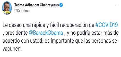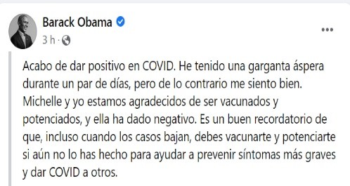 El expresidente de Estados Unidos, Barack Obama anunció este domingo a través de su cuenta de Twitter que dio positivo a COVID, mencionó que se siente bien."He tenido la garganta áspera durante un par de días, pero por lo demás me siento bien", dijo en su cuenta de Twitter.Además, el expresidente señaló que su esposa, Michelle Obama dio negativo al virus."Michelle y yo estamos agradecidos de haber sido vacunados y tener el refuerzo”, dijo el exmandatario.Obama también mandó un mensaje recordando la importancia de vacunarse ante el COVID."Es un buen recordatorio de que, incluso a medida que disminuyen los casos, debe vacunarse y conseguir el refuerzo si aún no lo ha hecho para ayudar a prevenir síntomas más graves y prevenir transmitir COVID a otros".Recientemente Obama regresó a Washington, después de pasar gran parte del invierno en Hawái, reportó CNN.El director general de la Organización Mundial de la Salud (OMS), Tedros Adhanom Ghebreyesus, mandó un mensaje a Obama, deseando su pronta recuperación."Le deseo una rápida y fácil recuperación de #COVID19, presidente @BarackObama, y no podría estar más de acuerdo con usted: es importante que las personas se vacunen".MF