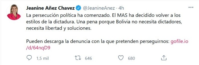 La Fiscalía de Bolivia emitió el viernes una orden de detención contra la expresidenta Jeanine Áñez y varios de sus ministros por sedición y terrorismo, según una copia de la orden difundida por la propia exmandataria.El Ministerio Público aún no se ha pronunciado oficialmente sobre la medida, pero la televisión local emitió imágenes de la detención de varios exministros.Jeanine Áñez publicó en Twitter la resolución el fiscal junto al texto "la persecución política ha comenzado".Lidia Patty, exlegisladora del partido oficialista Movimiento Al Socialismo (MAS), denunció en diciembre pasado que Áñez, junto con varios de sus exministros, exmilitares, expolicías y civiles, había promovido el derrocamiento del izquierdista Evo Morales en noviembre de 2019, tras 14 años en el poder.La exdiputada del MAS presentó la denuncia por los supuestos delitos de sedición, terrorismo y conspiración."El MAS ha decidido volver a los estilos de la dictadura. Una pena porque Bolivia no necesita dictadores, necesita libertad y soluciones", escribió Áñez en Twittter.La orden de los fiscales alcanza a los exministros Arturo Murillo (Interior), Luis Fernando López (Defensa), Yerko Núñez (Presidencia), Álvaro Coímbra (Justicia) y Rodrígo Guzmán (Energía).JM