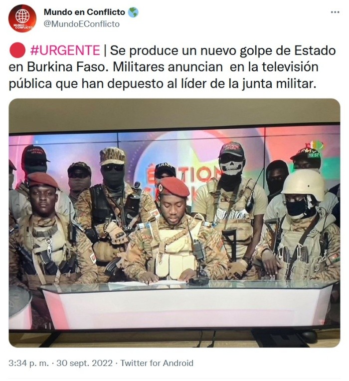 El jefe de la junta militar de Burkina Faso, el teniente coronel Paul-Henri Sandaogo Damiba, quien llegó al poder por un golpe a fines de enero, fue destituido por militares el viernes por la noche, según una declaración leída en la televisión nacional.Los golpistas también anunciaron el cierre de las fronteras terrestres y aéreas a partir de medianoche, así como la suspensión de la Constitución y la disolución del gobierno.Tras una jornada caracterizada por tiroteos en el barrio de la presidencia en Ugadugú, unos quince soldados, algunos con el rostro cubierto, hablaron poco antes de las 20:00 horas por la radiotelevisión nacional."El teniente coronel Damiba fue destituido de sus funciones de presidente del Movimiento Patriótico para la Salvaguarda y la Restauración" (MPSR, órgano dirigente de la junta), declararon los militares en un comunicado leído por un capitán.El nuevo hombre fuerte del país, designado presidente del MPSR, es ahora el capitán Ibrahim Traoré, agregó.Fue también declarado un toque de queda de 21:00 a las 05:00 horas.Los militares invocan "la degradación continua de la situación de seguridad" en el país."Hemos decidido asumir nuestras responsabilidades, animadas por un único ideal, la restauración de la seguridad y la integridad de nuestro territorio", añadieron.El golpe de Estado realizado en enero por el teniente coronel Damiba derrocó al presidente elegido Roch Marc Christian Kaboré.JM