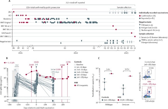 En los seres humanos, los beneficios, las limitaciones y los riesgos de la vacunación repetida siguen siendo poco conocidos, señala el artículo "Adaptive immune responses are larger and functionally preserved in a hypervaccinated individual", publicado en la revista médica británica The Lancet en su sección Infectious Diseases.En dicho artículo, se documentó el caso de un hombre hipervacunado de 62 años de Magdeburgo, Alemania (al que nos referimos como HIM), que deliberadamente y por razones privadas recibió 217 vacunas contra el SARS-CoV-2 en un período de 29 meses.De acuerdo con The Lancet, la hipervacunación de HIM se produjo fuera del contexto de un estudio clínico y en contra de las recomendaciones nacionales de vacunación.El fiscal de Magdeburgo, Alemania, recopiló pruebas de 130 vacunas en un período de 9 meses y abrió una investigación de este caso con la acusación de fraude, pero no se presentaron cargos penales. 108 vacunas están registradas individualmente y en parte se superponen con el total de 130 vacunas confirmadas por el fiscal.Para investigar las consecuencias inmunológicas de la hipervacunación en esta situación única, The Lancet presentó una propuesta de análisis a través del fiscal. Luego, HIM consintió activa y voluntariamente en proporcionar información médica y donar sangre y saliva. De acuerdo con el artículo, este procedimiento fue aprobado por el Comité de Ética local del Hospital Universitario de Erlangen, Alemania. Durante todo el calendario de hipervacunación, HIM no informó ningún efecto secundario relacionado con la vacunación.Desde noviembre de 2019 hasta octubre de 2023, 62 parámetros de química clínica de rutina no mostraron anomalías atribuibles a la hipervacunación.Además, HIM no tenía signos de una infección pasada por SARS-CoV-2, como lo indican las pruebas de antígeno del SARS-CoV-2, las PCR y la serología de nucleocápside (la proteína viral más abundante expresada durante la infección), repetidamente negativas.Durante el estudio, no se observó un mayor grado de expansión clonal (incremento de la abundancia de un determinado genotipo producido mediante división celular) o tasas de hipermutación somática (mecanismo celular, que forma parte del modo en cómo se adapta el sistema inmunitario a nuevos elementos extraños).En resumen, en el informe del caso, The Lancet señala que la hipervacunación contra el SARS-CoV-2 no provocó eventos adversos y aumentó la cantidad de anticuerpos y células T específicos de picos, sin tener un fuerte efecto positivo o negativo sobre la calidad intrínseca de las respuestas inmunes adaptativas. Si bien hasta la fecha no han encontrado signos de infecciones irruptivas por SARS-CoV-2 en HIM, no se puede aclarar si esto está causalmente relacionado con el régimen de hipervacunación. Los resultados de las pruebas realizadas a este hombre fueron insuficientes para sacar conclusiones de gran alcance, y mucho menos para hacer recomendaciones para el público, según los expertos.Por lo anterior, The Lancet es enfático y señala en su artículo, que no respaldan la hipervacunación como estrategia para mejorar la inmunidad adaptativa.*Mantente al día con las noticias, únete a nuestro canal de WhatsApp aquí: https://whatsapp.com/channel/0029VaAf9Pu9hXF1EJ561i03MV