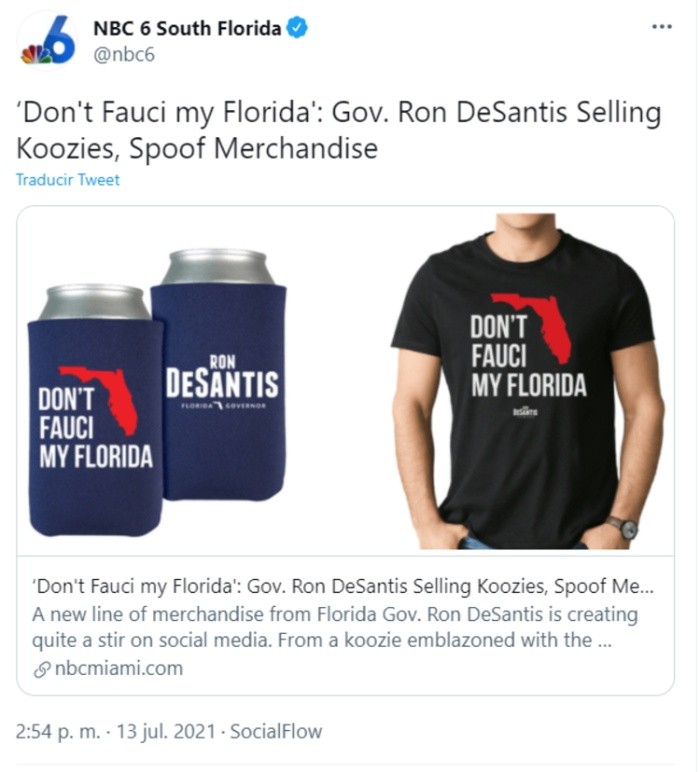 El gobernador de Florida, el republicano Ron DeSantis, ha puesto a la venta en medio de un repunte de los casos de COVID-19 en el estado una línea de camisetas y otros productos promocionales con su nombre y leyendas en contra del epidemiólogo Anthony Fauci y sus medidas contra la pandemia.El lanzamiento de estos productos, que obedece a las aspiraciones políticas de uno de los seguidores del ex presidente Donald Trump, pero con quien podría competir por la nominación republicana en 2024, ha generado críticas en las redes sociales y de parte de grupos demócratas.Uno de los productos de la línea, una funda para mantener frías las latas de bebidas, lleva la leyenda "¿Cómo diablos voy a beber una cerveza con el cubrebocas puesto?".En una camiseta, que se puede comprar a través de la web de DeSantis, se lee "Don't Fauci my Florida", que viene a decir que no metan las medidas del epidemiólogo en un estado que es el tercero en número de casos acumulados de COVID-19 y el cuarto en número de muertes por la enfermedad, según la Universidad Johns Hopkins."El fracaso de Ron DeSantis en proteger a los floridanos durante la pandemia pasará a la historia como una de las mayores catástrofes de este estado", indicó en las redes el grupo "Ron Be Gone" (Vete Ron), contrario a la reelección de DeSantis como gobernador en 2022.DeSantis se destacó durante el año 2020 por no seguir las indicaciones de los Centros de Control y Prevención de Enfermedades (CDC) en cuanto a medidas preventivas -ni siquiera hizo obligatorio el uso de mascarillas- y por mantener abierta la economía a toda costa.Su apuesta fue por las vacunas, que comenzaron a aplicarse en diciembre pasado con el lema "los mayores primero" y en poco más de tres meses fueron accesibles a toda la población e incluso a personas de otros países, el llamado "turismo de vacunación".Sin embargo, la inmunidad del rebaño que se pretendía no se logró precisamente por la reticencia de muchos floridanos a vacunarse.Una de sus medidas más criticadas y contradictorias fue la de prohibir por ley que las empresas y organismos públicos puedan exigir certificados de vacunación a clientes o empleados.Mientras por un lado se enfrascó en una batalla legal contra los CDC para poder saltarse las normas de ese organismo gubernamental con el fin de que los barcos pudieran volver a navegar, por otro al prohibir la exigencia de vacunas puso a las navieras en un situación difícil que ya ha tenido consecuencias legales.Norwegian Cruise Line demandó este martes al cirujano general de Florida, Scott Rivkees, por la ley estatal que prohíbe a las empresas pedir pruebas de vacunación contra el COVID-19, a un mes de que esta compañía con sede en Miami reanude sus cruceros.En la demanda presentada en un tribunal de Miami, la empresa matriz, Norwegian Cruise Line Holdings, señala que está lista para la reactivación el 15 de agosto de sus cruceros de acuerdo con la ley vigente y la Orden de Navegación Condicional administrada por los Centros de Control y Prevención de Enfermedades (CDC).Pero las empresas, ya sean cruceros, restaurantes o recintos de espectáculos que violen la ley estatal citada estarían sujetas a una multa de cinco mil dólares cada vez que requieran a un cliente el llamado "pasaporte de vacunación" para prestarle un servicio.De acuerdo con las últimas cifras oficiales del estado, que se divulgan cada viernes, el número de casos confirmados de COVID-19 en Florida aumentó la semana pasada a un ritmo no registrado en dos meses con un total de 23 mil 697 nuevos contagios entre el 2 y 8 de julio, y una tasa de positividad que alcanzó el 7.8 %.Desde el 1 de marzo de 2020 hasta este viernes se habían registrado en este estado dos millones 361 mil 360 casos y 38 mil 157 muertes a causa de COVID-19, con 32 muertes durante esta semana.En el estado, con una población de más de 21 millones de habitantes, se han vacunado 11 millones 138 mil 986 personas.La semana pasada solo se inmunizó a 207 mil 089 personas en Florida.OF