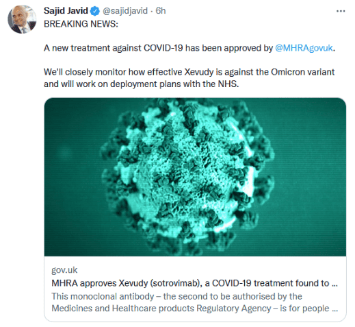 El Gobierno de Reino Unido anunció hoy jueves que aprobó el uso del anticuerpo monoclonal Xevudy (sotrovimab) para personas mayores de 12 años, un medicamento que podría reducir en hasta un 79% el riesgo de hospitalización y muerte por el COVID-19.La Agencia Reguladora de Medicamentos (MHRA, por sus siglas en inglés) ha dado el visto bueno a este fármaco, desarrollado por el laboratorio británico GlaxoSmithKline, después de constatar que rebaja los riesgos en personas de alto riesgo que presentan síntomas de la enfermedad.El ministro de Sanidad, Sajid Javid, destacó en su cuenta de Twitter que los expertos trabajan ahora para determinar la eficacia de Xevudy contra la nueva variante ómicron del coronavirus.En este sentido, GlaxoSmithKline, que ha colaborado con el laboratorio estadounidense Vir Biotechnology, señaló que los ensayos preclínicos muestran que el fármaco "retiene actividad contra mutaciones clave" de ómicron, si bien la NHRA ha precisado que aún es pronto para confirmarlo."Sotrovimab ha sido diseñado deliberadamente con la mente puesta en un virus mutante. Al apuntar a una región de la proteína de la espícula que tiene menos probabilidades de mutar, confiábamos en lidiar tanto con el virus actual Sars-CoV-2 como con las variantes futuras que esperábamos que fueran inevitables", explicó en un comunicado el consejero delegado de Vir, George Scangos.La MHRA subrayó hoy que Xevudy se podrá administrar a mayores de 12 años que presenten una infección de COVID-19 leve o moderada y con, al menos, un factor de riesgo para desarrollar una enfermedad grave."Tales factores de riesgo incluyen la obesidad, edad avanzada (más de 60 años), diabetes mellitus o enfermedades cardiacas", precisó la agencia reguladora del Reino Unido, que confirmó que ha encargado más de 100 mil dosis del fármaco, el cual se aplica por "infusión intravenosa durante 30 minutos".GC