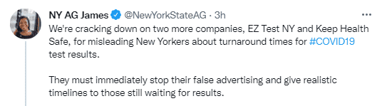 Los laboratorios que publicitan pruebas rápidas PCR de COVID en la ciudad y el estado de Nueva York tardan hasta 11 días en dar resultados, fue tan criticada la situación que la fiscal de Nueva York ordenó que se deje de emitir la publicidad, pues cataloga en engañosa ya que promete resultados en 24 hrs con un máximo de 48 hrs.Es la quinta vez que la fiscal Letitia James lanza advertencias a compañías que se dedican a realizar pruebas rápidas, desde que se han registrado dos quejas sobre las marcas EZ Test NY y Keep Health Safe, la queja consiste en que están tardando en entregar los resultados desde saliente días y en algunos casos hasta once.La fiscal les recuerda por medio de una carta que lo que hacen es igual a hacer "falsas promesas” en un momento en el que “los porcentajes de positividad (en las pruebas COVID) están disparados por el ómicron y las reuniones navideñas". En el mismo texto, que se hizo público, la fiscal Letitia llama a los ciudadanos a denunciar estos retrasos al número de teléfono de la oficina contra fraude y de protección al consumidor.El porcentaje de casos positivos en Nueva York ya rebasó el 20% en la última semana, y el número de pruebas realizadas es el mayor antes visto con 51 mil 968 positivos de 223 mil 153 pruebas hechas, cifras tan solo el día de ayer.A inicios de diciembre del 2021, las pruebas tenían un retraso de horas, pero la entrega de los resultados comenzaron a registrar una tardanza cada vez más larga mientras más se acercaban las fechas de la navidad, a su vez las filas en los puestos móviles de COVID eran más largas conforme avanzaban los días.Letitia James comenzó a enviar las cartas el 21 de diciembre, los escritos son una advertencia a las compañías, y a partir de esta fecha ya han sido seis las compañías que deben dar explicaciones a sus clientes lo que "de manera realista pueden esperar con respecto a sus resultados".Las pruebas de COVID son en la mayoría de lugares gratuitos tanto para los ciudadanos como para los turistas, el costo es asumido por las compañías de seguros, y en el caso de las personas que no cuentan con alguno, el costo lo absorbe el gobierno local, estatal y federal.DO