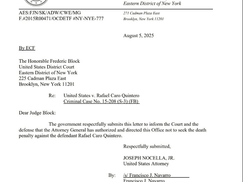 Hace unos momentos, el Departamento de Justicia de Estados Unidos anunció que no solicitará la pena de muerte para los presuntos narcos mexicanos Ismael "Mayo" Zambada, Vicente Carrillo Fuentes "El Viceroy" y Rafael Caro Quintero.El fiscal Joseph Nocella Jr. habría desistido de solicitar este nivel de sanción para el exlíder criminal.La información fue publicada por los periodistas Alan Feuer y Keegan Hamilton con un documento de las autoridades estadounidenses que señala lo siguiente:“El Gobierno respetuosamente presenta esta carta para informar a la Corte y a la defensa que el Procurador General de la República ha autorizado y ordenado a esta Oficina no buscar la pena de muerte contra el acusado Rafael Caro Quintero” se lee en el documento.* * * Mantente al día con las noticias, únete a nuestro canal de Whatsapp * * *OB