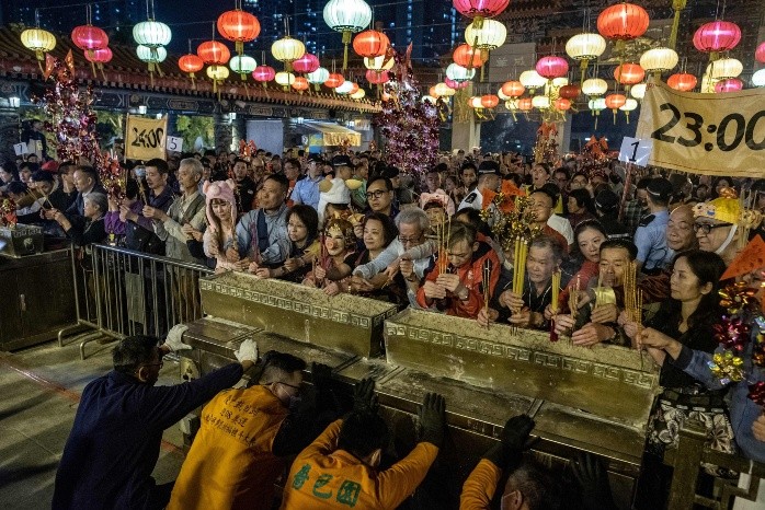 En Hong Kong, los fieles hicieron fila durante horas en el templo Wong Tai Sin para recibir el año prendiendo incienso.