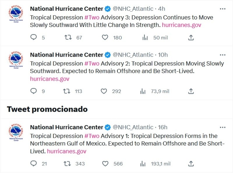 La segunda depresión tropical de 2023 formada en la cuenca atlántica avanza este viernes lentamente hacia el sur a través del Golfo de México sin grandes cambios en la fuerza del sistema, por lo que no hay alertas costeras ni avisos en vigor.El Centro Nacional de Huracanes (NHC, en inglés), con sede en Miami (Florida), informó en su boletín más reciente que el sistema se sitúa a 460 kilómetros de Fort Myers, localidad de la costa oeste de Florida, y 590 kilómetros del noroeste de Cuba.La depresión tropical avanza con vientos máximos sostenidos de 55 kilómetros por hora. El centro del sistema se ubica cerca de la latitud 27 norte con longitud 86.5 oeste mientras se mueve hacia el sur a cerca de siete kilómetros por hora. El boletín del NHC señala que se espera que un debilitamiento del sistema comience durante el día de hoy y que el sistema se degrade a un mínimo remanente el sábado.La temporada oficial de huracanes comenzó este jueves en la cuenca atlántica con pronósticos que indican que el número de ciclones puede estar dentro del promedio y la incógnita de cómo afectará la presencia del fenómeno climático "El Niño".La temporada de huracanes de 2023 en el Atlántico tendrá al menos 12 tormentas con nombres, de ellas entre cinco y nueve se convertirán en huracanes, y al menos uno podría ser huracán mayor, según anunció el pasado 25 de mayo la Administración Nacional Oceánica y Atmosférica (NOAA) de Estados Unidos al vaticinar una temporada "casi normal". JM