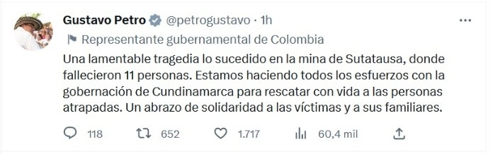 Los fallecidos en la explosión de una mina de carbón en la localidad de Sutatausa, en el departamento colombiano de Cundinamarca, ascienden ya a once y los equipos de rescate siguen buscando a otras diez personas, informaron las autoridades este miércoles.La explosión ocurrió el martes por la noche en la zona de El Cajón, y afectó a las minas El Hoyo, Lucero y La Esperanza, en Sutatausa, donde decenas de mineros trabajaban en varias galerías subterráneas de las que se extrae carbón de forma manual.El presidente colombiano, Gustavo Petro, lamentando la tragedia en un mensaje en sus redes sociales, informó de la cifra de los 11 fallecidos y aseguró que están "haciendo todos los esfuerzos con la Gobernación de Cundinamarca para rescatar con vida a las personas atrapadas".Por su parte el gobernador de Cundinamarca, Nicolás García, afirmó: "aún estamos en la búsqueda para rescate de 10 mineros que aún se encuentran atrapados", en declaraciones al noticiero de Caracol TV.Los equipos de rescate trabajan desde anoche para conseguir sacar a las personas atrapadas, mientras familiares de los mineros esperan en los alrededores noticias de sus seres queridos.Se trata de "tres minas que están conectadas, que hacen parte de un complejo", como explicó el director de la Unidad de Gestión de Riesgos y Desastres (UGRD), Javier Pava, quien está esperando reportes de otras autoridades sobre las posibles causas y si tenían las inspecciones medioambientales al día.En el departamento de Cundinamarca y el vecino Boyacá hay centenares de minas de carbón en las que trabajan miles de mineros, no siempre con las condiciones de seguridad necesarias, lo que ha ocasionado varios accidentes con víctimas mortales a lo largo de las últimas décadas.JM