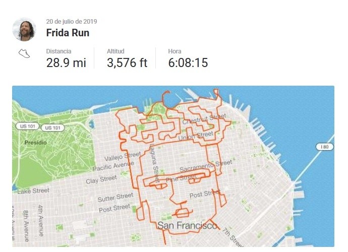 Lenny Maughan un corredor de San Francisco se ha hecho popular después de que un amigo publicara su proyecto de "Running Art".Maughan ha trazado distintas figuras como Frida Kahlo por medio de las rutas que hace cuando sale a correr. Según el medio SFGate, Maughan ha estado realizando Running Art mensualmente durante tres años, sumando más de 30 piezas.Para hacer los dibujos, usa la aplicación Strava que ayuda a registrar las últimas carreras, ciclos y todas las estadísticas por medio del GPS.Por ejemplo, la imagen de Frida Kahlo la realizó con una carrera de 28.93 millas (43.5 kilómetros), con una elevación de tres mil 500 pies y un tiempo de seis horas y ocho minutos. El atleta describe el proceso de planeación de la pieza como "bastante análoga". Indica que primero imprime un mapa en papel y destaca su ruta que usará y confiesa que mientras está en la carrera, tiene mucho cuidado de seguir la ruta pues "si da un giro equivocado podría arruinar toda la pieza"."No puedes ver las líneas dibujadas hasta después de que termines tu carrera, por lo que es una sensación muy emocionante cuando pones todo tu esfuerzo y finalmente terminas y ves lo que diseñaste", relata Maughan en el diario local.Maughan es residente de San Francisco por más de 20 años y señala que siempre recurrirá a las calles de la ciudad en busca de inspiración. "San Francisco es mi lienzo. Uso las calles como marco para lo que quiero hacer, encontrar formas y hacer que funcione. Algo así como la forma en que los niños pequeños miran las nubes". finaliza.jb
