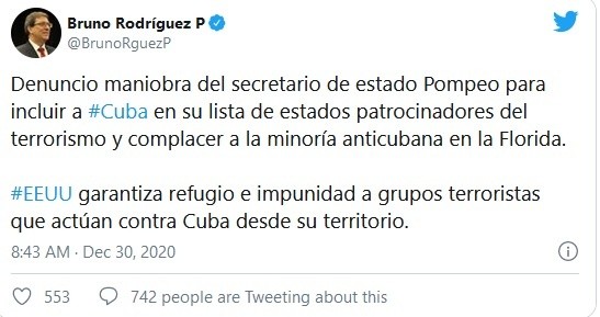 Cuba advirtió el miércoles a la administración saliente de Estados Unidos que no la vuelva a incluir en la lista de estados que patrocinan el terrorismo, una medida que, según se informa, se está debatiendo y que podría obstaculizar la diplomacia del presidente electo Joe Biden.El secretario de Estado, Mike Pompeo, está analizando la posibilidad de, antes de dejar el cargo el 20 de enero, volver a incluir a Cuba en esa lista negra, lo que impondría severas limitaciones a la inversión extranjera, dijo una persona cercana al caso.Citando a un alto funcionario de la administración saliente que no quiso revelar su nombre, la cadena CNN dijo que Pompeo tomaría la medida "en los próximos días".El New York Times informó por primera vez que el Departamento de Estado había elaborado una propuesta en ese sentido, pero señaló que no estaba claro si Pompeo la aprobaría."Denuncio las maniobras del Sec de Estado Pompeo para incluir a #Cuba en la lista de Estados patrocinadores del terrorismo para complacer a la minoría anticubana en Florida", escribió en Twitter el canciller cubano, Bruno Rodríguez."#US otorga refugio e impunidad a los grupos terroristas que actúan contra Cuba desde su territorio", indicó, en una referencia habitual a los activistas anticomunistas cubanoestadounidenses.La discusión se produce antes del 60 aniversario, el 3 de enero, de la ruptura de las relaciones diplomáticas entre Estados Unidos y la isla tras la revolución cubana encabezada por Fidel Castro.Bajo la administración del expresidente Barack Obama, Estados Unidos reconoció el fracaso de la política de aislar a La Habana, estableció relaciones diplomáticas y eliminó a Cuba de la lista de estados terroristas en 2015.Joe Biden, que fue vicepresidente de Obama, no ha brindado detalles sobre su futuro política hacia Cuba, pero ha indicado que volvería a relajar las restricciones a los estadounidenses que viajan a la isla y el envío de remesas, mientras sigue planteando preocupaciones sobre el respeto a los derechos humanos.JM