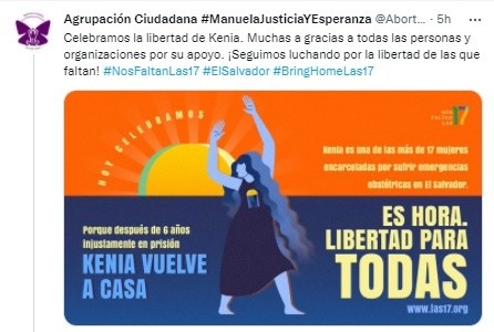 En El Salvador, la justicia otorgó a una mujer la libertad condicional después de haber pasado 9 años en prisión por una condena de 30 años que se le impuso por el delito de homicidio agravado que supuestamente cometió al abortar.La Agrupación Ciudadana por la Despenalización del Aborto expresó a través de un comunicado que la mujer (identificada únicamente como Kenia) fue víctima de una agresión sexual, quedando embrazada y sufriendo posteriormente una emergencia obstétrica.Kenia fue "arrestada por la Policía y luego fue juzgada por el delito de homicidio agravado", por el que fue condenada a 30 años de cárcel."Celebramos que Kenia sea liberada después de estar 9 años en la cárcel. Su condena de 30 años por homicidio agravado ha terminado (...) seguiremos luchando sin descanso y de forma colectiva para liberar a las mujeres que aún están injustamente detenidas", señaló Morena Herrera, de la Agrupación Ciudadana.De acuerdo con la organización, "Kenia es la cuarta mujer liberada de 17 salvadoreñas encarceladas injustamente por sufrir emergencias de salud durante sus embarazos".Según las leyes del país centroamericano, las mujeres que llegan a sufrir complicaciones durante el embarazo y que luego desembocan en un aborto espontáneo suelen ser consideradas sospechosas de haber practicado aborto intencionado, el cual está prohibido bajo cualquier circunstancia, y terminan siendo procesadas bajo el cargo de homicidio agravado, cuya pena de cárcel es de 30 años."La prohibición total del aborto en El Salvador hoy sigue cobrando vidas o sigue poniendo injustamente a las mujeres en la cárcel", subrayó Alcalde en un mensaje brindado por videoconferencia durante una rueda de prensa en San Salvador por el caso de Beatriz.Beatriz, ya fallecida, fue una joven a quien en 2013 se le impidió interrumpir su embarazo.DO