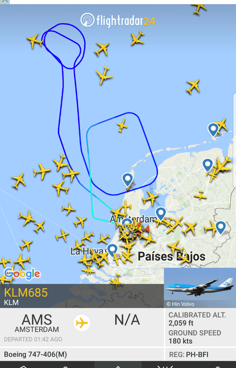 Un avión de la aerolínea KLM que va de Ámsterdam a México fue declarado en estado de emergencia poco después de despegar del aeropuerto de Ámsterdam. Los primeros reportes señalaron que el vuelo KL685 sufrió el impacto de un ave en uno de los motores. Por ello, el avión se dispuso a regresar al aeropuerto, pero antes se está deshaciendo del combustible. En mapas de seguimiento de vuelos se puede ver cómo el Boeing-747 sobrevoló en círculos sobre el Mar del Norte para quemar el combustible. Cerca de las 10:00 horas, se reportó que el avión había logrado aterrizar sin contratiempos en Ámsterdam.