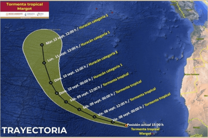 La mañana de este jueves, el Centro Nacional de Huracanes (NHC, por su nombre en inglés) informó que la zona de sospecha ciclónica AL96 pasó a convertirse en la depresión tropical 14 en este del Atlántico.No obstante, anunciaron que en cualquier momento de la tarde este sistema podría subir a tormenta tropical y una vez sucediendo eso, llevaría el nombre de Margot.Es así que esta tarde el Servicio Meteorológico Nacional (SMN) informó que la depresión tropical número 14 situada en el Océano Atlántico ya se había convertido en la tormenta tropical de nombre Margot.De acuerdo con la información, su centro se encuentra a 465 kilómetros al oeste-noroeste de las islas Cabo Verde, África por lo que no representa riesgo alguno para el territorio mexicano pues se encuentra a 6 mil 140 kilómetros de las costas de Quintana Roo.Hasta el momento, presenta un desplazamiento de 28 km/h hacia el oeste-noroeste con vientos máximos de 65 kilómetros por hora.El pronóstico indica que se mantendrá como tormenta tropical hasta el sábado 09 de septiembre y a partir del domingo podría subir a huracán categoría 1.Se espera que mantenga esa misma dirección, de este modo no tocaría tierra por lo que no representaría ningún riesgo.YC