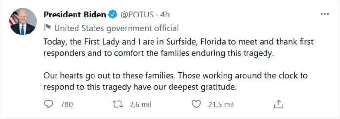 El presidente de Estados Unidos, Joe Biden, se reunió este jueves con familiares de las víctimas y desaparecidos en el derrumbe de un edificio de apartamentos en Surfside, en el sur de Florida, que hasta el momento ha dejado 18 muertos y 145 desaparecidos.Biden sostuvo el encuentro a puerta cerrada en el hotel St. Regis de Bal Harbour, una localidad vecina y al norte de Surfside, con familiares que fueron llegando al lugar en autobuses y poco antes del mediodía.El presidente ofreció unas breves palabras desde el centro del salón que albergó el encuentro, tras lo cual, y acompañado de la primera dama, Jill Biden, y de autoridades locales, se acercó a cada una de las mesas en el salón para hablar con los familiares que fueron parte de la reunión, según el equipo de periodistas que lo acompaña.Algunos familiares y allegados, no obstante, optaron por no acudir al encuentro y hasta mostraron su inconformidad con la visita del presidente al señalar que puede obstaculizar las labores de los socorristas."No estoy interesado en hablar con él", señaló a la cadena CNN Avi Cohen, cuyo padre y tío, Brad Cohen y Gary Cohen, respectivamente, se cuentan entre los desaparecidos.Asimismo, Pablo Rodríguez, cuya madre, Elena Blasser, y abuela, Elena Chávez, también figuran como desaparecidas a causa del derrumbe del Champlain Towers South, comentó a la cadena que optó por llevar a su hijo a un consejero para casos de duelo antes que reunirse con el presidente."Me gustaría poder hablar con él sobre la necesidad de una reforma integral a nivel nacional", explicó, para luego agregar que "los principales problemas son sistémicos y hay millones que viven y trabajan en edificios en todo Estados Unidos".Miembros de la familia Ainsworth expresaron al medio Local10 el temor de que la visita del mandatario retrase las labores de búsqueda de quienes quedaron bajo los escombros, entre ellos el matrimonio compuesto por Tzvi y Itty Ainsworth."Son sobrevivientes y creemos que sobrevivirán a esto", dijo Chana Wasserman, una de las hijas.Precisamente, la madrugada de este jueves se detuvieron por primera vez las labores de búsqueda debido a que el equipo de ingenieros descubrió que una columna importante de la parte del condominio que ha quedado en pie empezó a moverse entre unas seis y 12 pulgadas, lo que implica el riesgo de otro colapso.JM