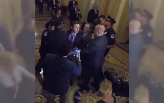 Un hombre fue detenido hoy por arrojar banderas rusas al presidente de EU, Donald Trump, mientras se dirigía a un almuerzo con senadores republicanos en el Congreso en Washington para abordar sus planes de reforma fiscal.El manifestante, identificado como Ryan Clayton, de 36 años, lanzó las banderas, en las que figuraba escrita la palabra "Trump", al grito de "¡Trump es traición!"."¿Por qué está usted hablando sobre recortes fiscales cuando debería estar hablando de traición?", preguntó Clayton, mientras el presidente caminaba junto el líder de la mayoría republicana en el Senado, Mitch McConnell.El manifestante, residente en el estado de Virginia, fue detenido por la Policía del Capitolio y acusado de conducta ilegal.El mismo individuo hizo una protesta similar en julio pasado con motivo de la comparecencia a puerta cerrada del yerno y asesor de Trump, Jared Kushner, ante el Comité de Inteligencia del Senado, informó la cadena ABC News.En la actualidad hay en marcha varias investigaciones, algunas de ellas en el Congreso, sobre la supuesta injerencia de Rusia en las elecciones presidenciales de 2016 en EU y los posibles vínculos del Kremlin con la campaña del magnate.Trump ha tildado esas investigaciones de "caza de brujas" y considera que no son más que excusas de la oposición demócrata por haber perdido los comicios.El mandatario acudió hoy al Capitolio para asistir a un almuerzo con senadores republicanos a fin de promover la unidad de su partido para abordar su plan de reforma fiscal.Sin embargo, el encuentro quedó empeñado por la guerra previa de descalificaciones mutuas entre Trump y el senador Bob Corker.Corker, enfrentado con el presidente desde hace tiempo, aconsejó a Trump quedarse al margen de la elaboración del plan fiscal y dejarlo en manos de "los profesionales", sugerencia a la que el mandatario respondió con insultos al senador en su cuenta de Twitter.Corker, actual presidente de la Comisión de Relaciones Exteriores del Senado, no se quedó callado tras los insultos y cuestionó la capacidad de Trump para gobernar, además de acusar al presidente de "degradar" a EU.