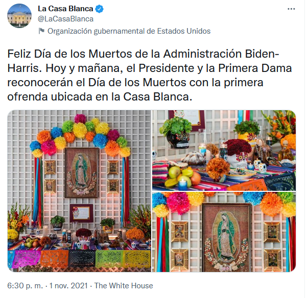 La cuenta de Twitter en español de la Casa Blanca escribió "Feliz Día de los Muertos de la Administración Biden-Harris", y dio a conocer que desde el lunes y hasta hoy martes, "el presidente y la Primera Dama (Jill Biden) reconocerán el Día de Muertos con la primera ofrenda ubicada en la Casa Blanca".El mensaje está acompañado de fotos de la ofrenda, en la que destaca la imagen de la Virgen de Guadalupe. Frutas, flores de cempasúchil y de otros tipos, calaveras, velas, pan de muerto, papel picado y hasta un juego de lotería, son algunos de los elementos incluidos en el altar, cubierto por un sarape mexicano.Joe Biden es el primer presidente católico en Estados Unidos desde John F. Kennedy. Además, es un ferviente devoto de la Virgen de Guadalupe, como él mismo reconoció en una visita a la Basílica en 2012, cuando era vicepresidente en la administración de Barack Obama.Incluso, en la reunión virtual que sostuvo con el presidente mexicano, Andrés Manuel López Obrador, en marzo pasado, Biden volvió a hablar de su devoción por la Guadalupana y recordó que "todavía tengo el rosario que tenía mi hijo cuando murió", en alusión a Beu, quien falleció por cáncer en 2015.OF